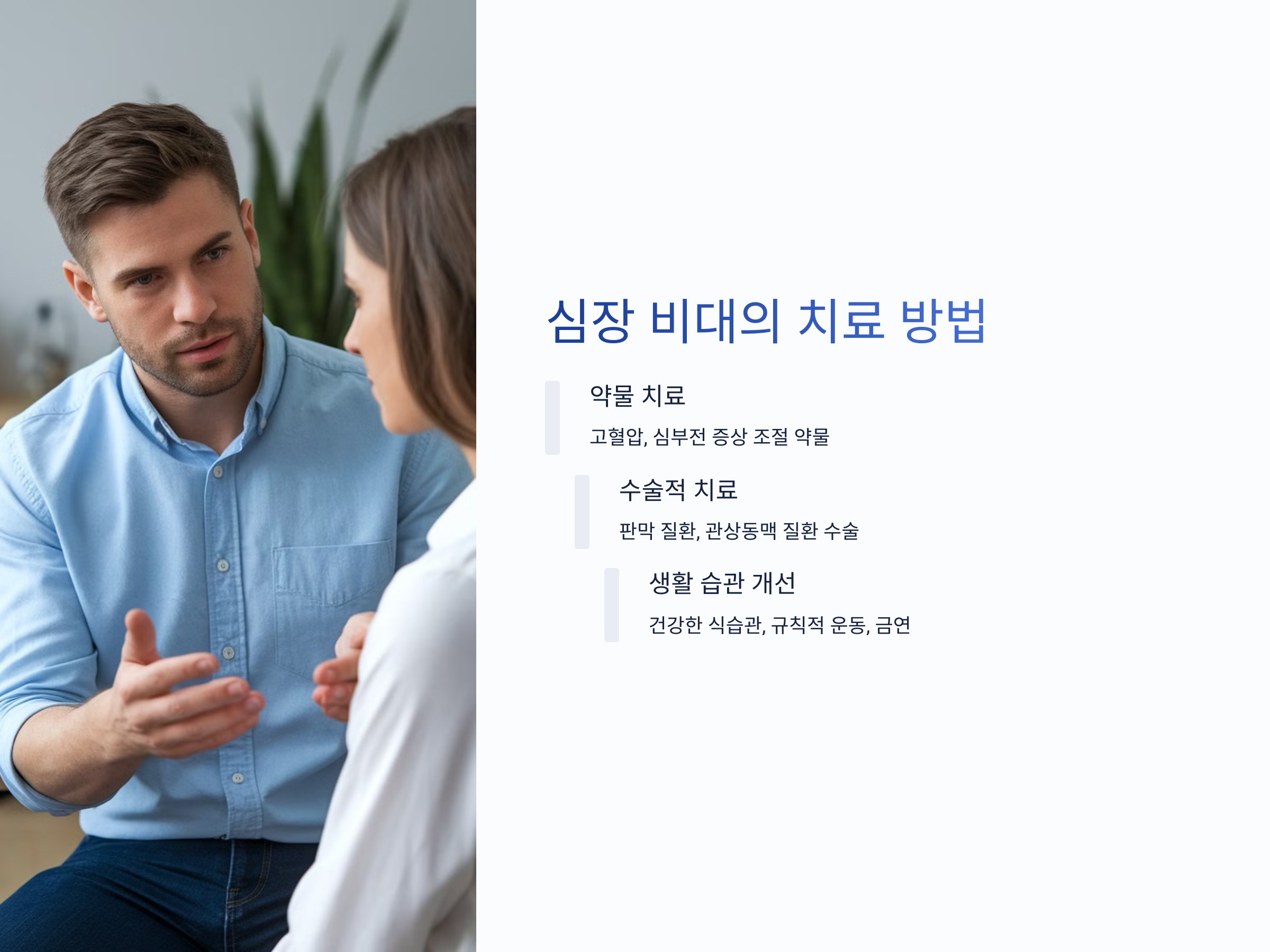 - 수술적 치료: 심장 판막 질환이나 관상동맥 질환이 원인인 경우 수술이 필요할 수 있습니다.