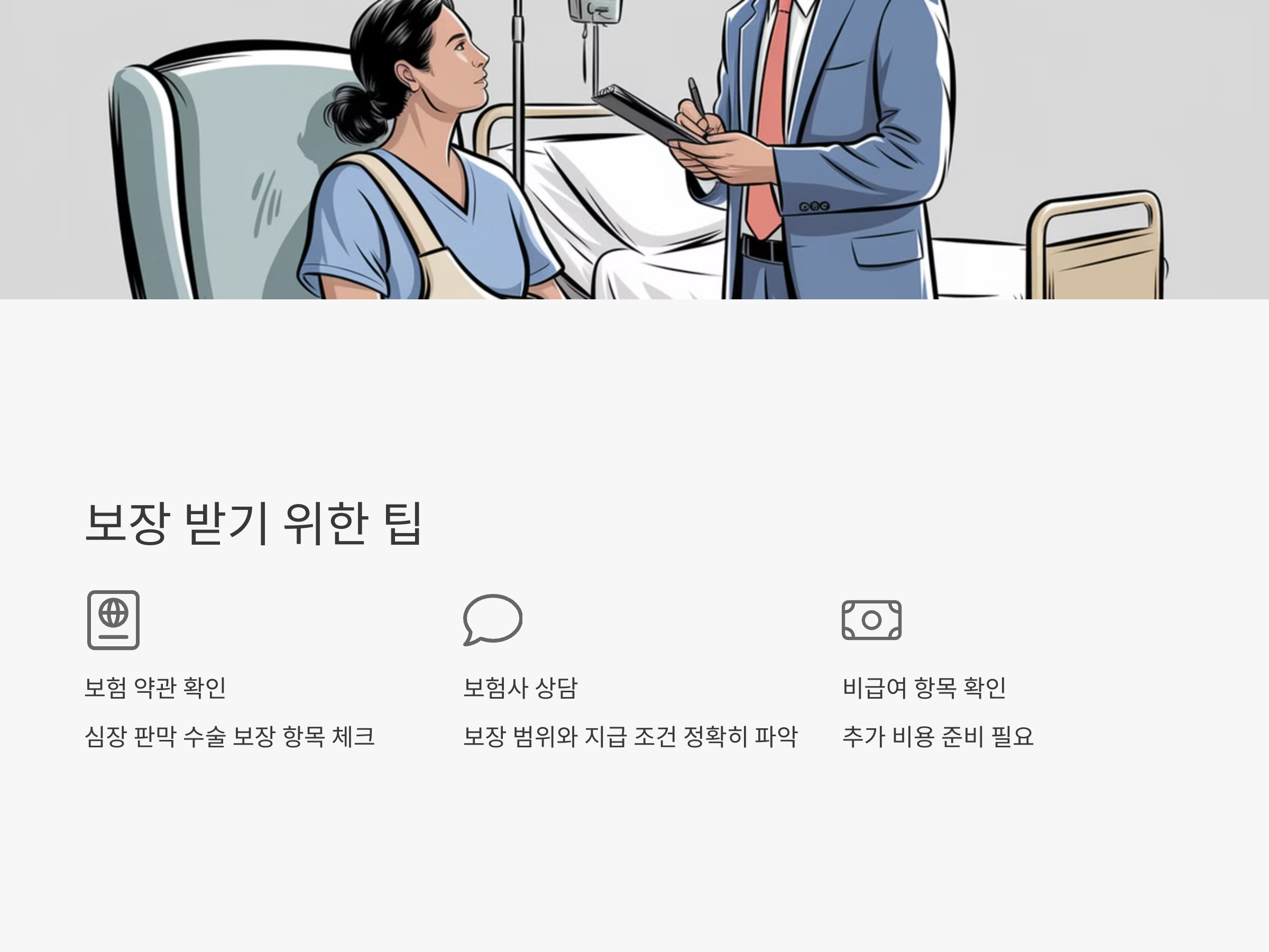 심장 판막 수술은 중요한 치료이므로, 수술 후 보험 보장 여부를 잘 확인하는 것이 매우 중요합니다. 실비보험과 건강보험을 적절히 활용하여 경제적 부담을 줄이고, 빠른 회복에 집중할 수 있도록 하세요.