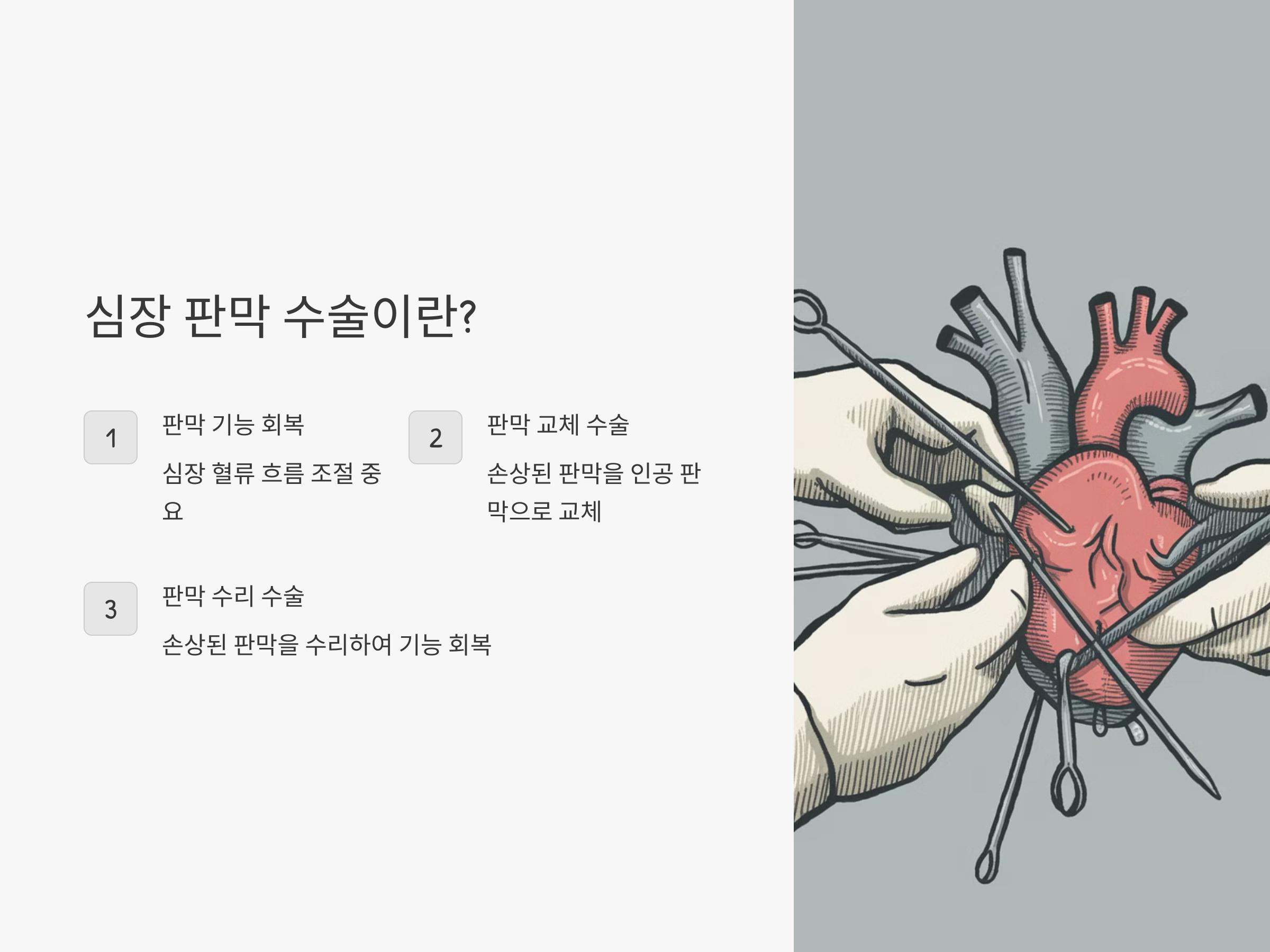- 판막 수리 수술: 손상된 판막을 수리하여 원래 기능을 회복시키는 방법입니다.
