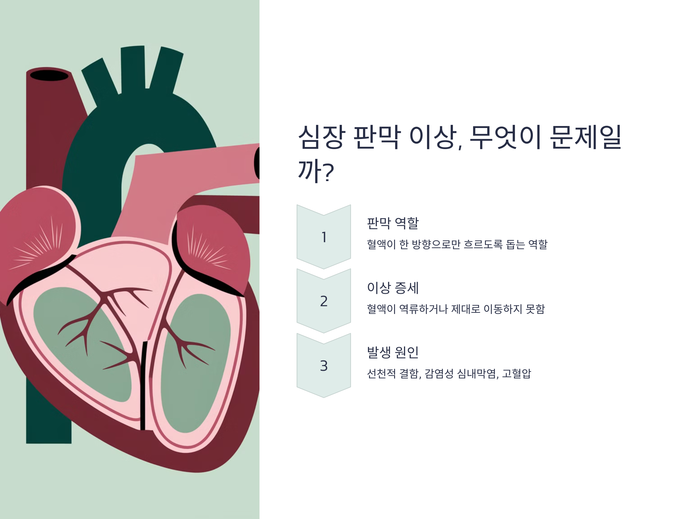 심장은 네 개의 판막을 통해 혈액의 흐름을 조절합니다. 이 판막들은 혈액이 한 방향으로만 흐르도록 돕는 역할을 합니다. 하지만 심장 판막에 이상이 생기면, 혈액이 원활하게 흐르지 못하고 역류하거나 제대로 이동하지 못하게 됩니다. 이런 상태를 심장 판막 질환이라고 하며, 그 결과로 피로, 숨 가쁨, 흉통 등의 증상이 나타날 수 있습니다.