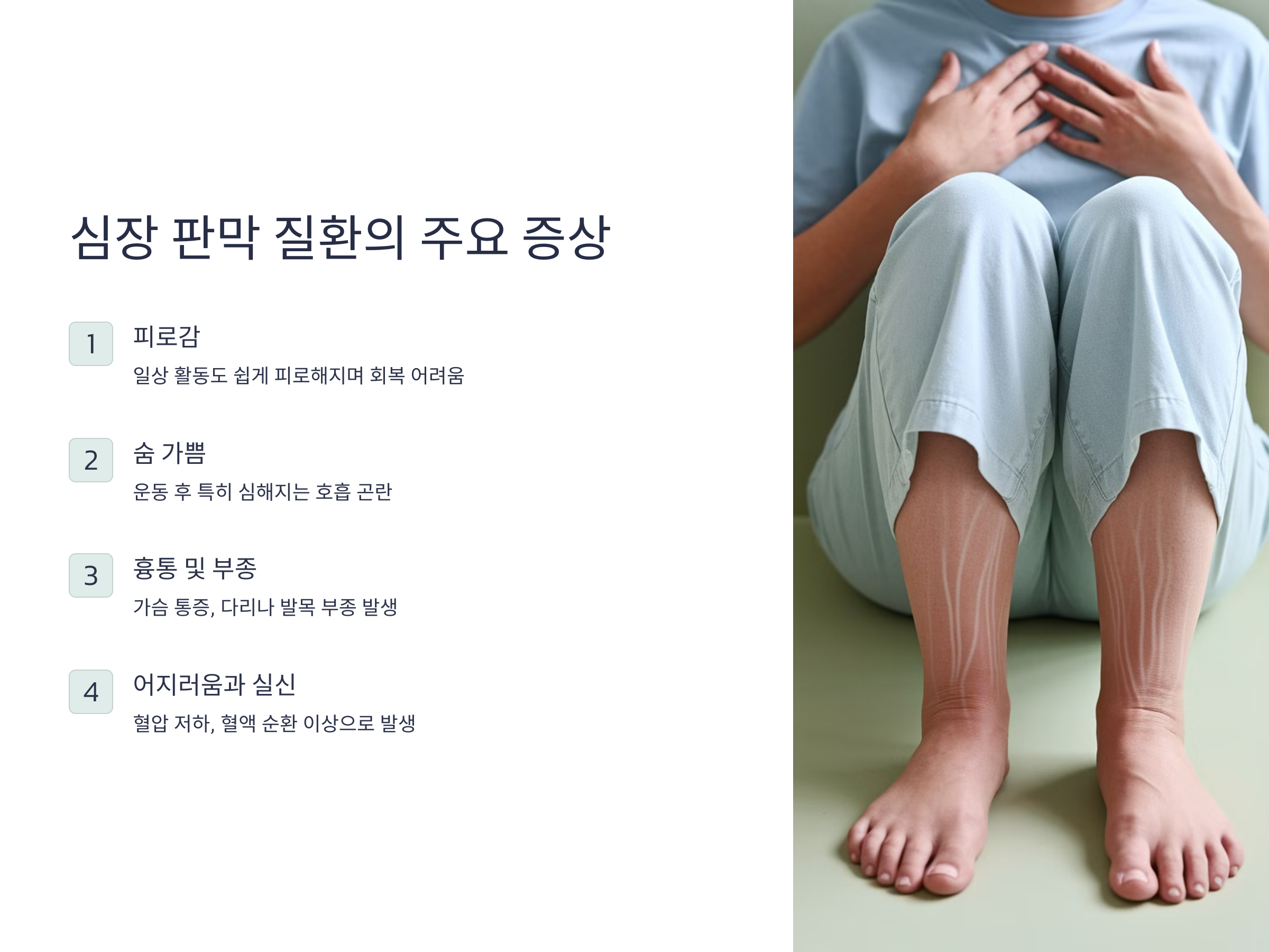 - 부종: 다리나 발목에 부종이 생기기도 합니다. 이는 혈액 순환이 원활하지 않기 때문에 발생할 수 있습니다.