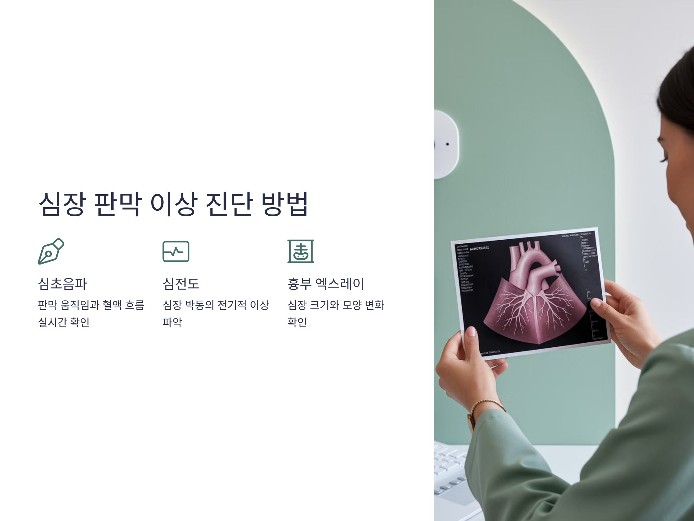 - 심초음파: 심장 판막의 움직임과 혈액 흐름을 실시간으로 볼 수 있어, 판막의 이상을 정확하게 확인할 수 있습니다.