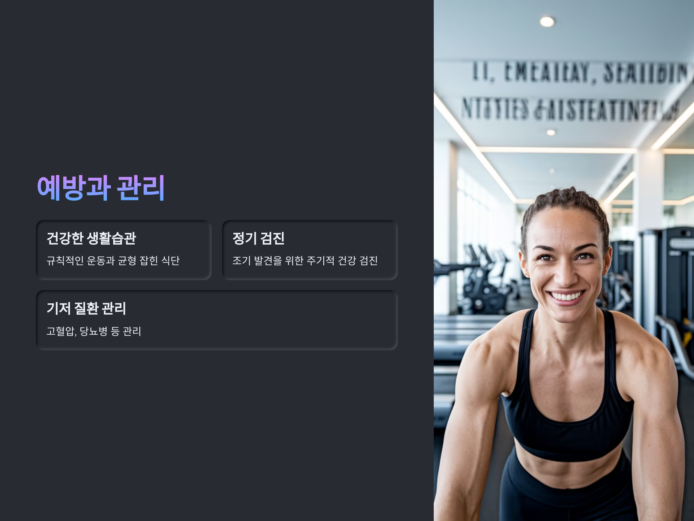 건강한 식습관과 규칙적인 운동을 통해 심혈관 건강을 유지하는 것이 중요합니다. 또한, 고혈압이나 당뇨병 등을 잘 관리하는 것이 예방에 도움이 됩니다.