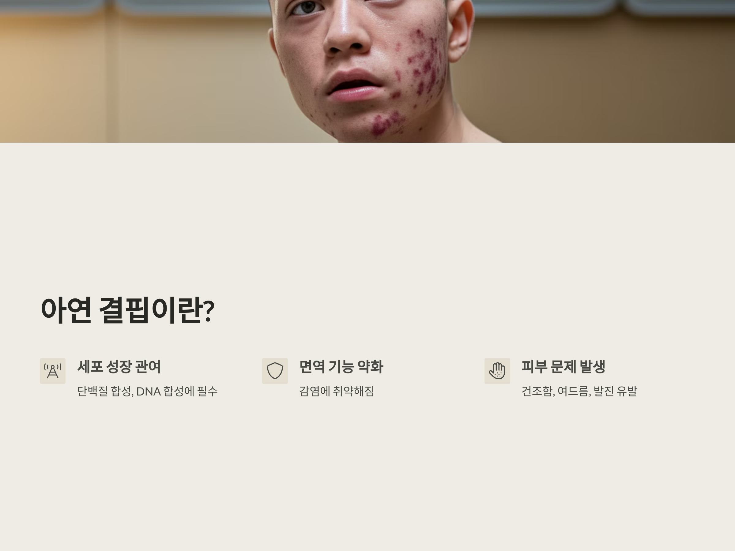 아연은 인간 몸에서 중요한 역할을 하며, 세포 성장, 면역 기능, 단백질 합성, DNA 합성 등 여러 생리적 과정에 관여합니다. 아연 결핍은 이러한 중요한 역할을 제대로 수행할 수 없게 하여, 다양한 건강 문제를 일으킬 수 있습니다. 아연 결핍 증상은 면역력이 떨어지고 감염에 취약해지며, 피부가 건조하고 여드름이나 발진 같은 피부 문제가 발생할 수 있습니다.