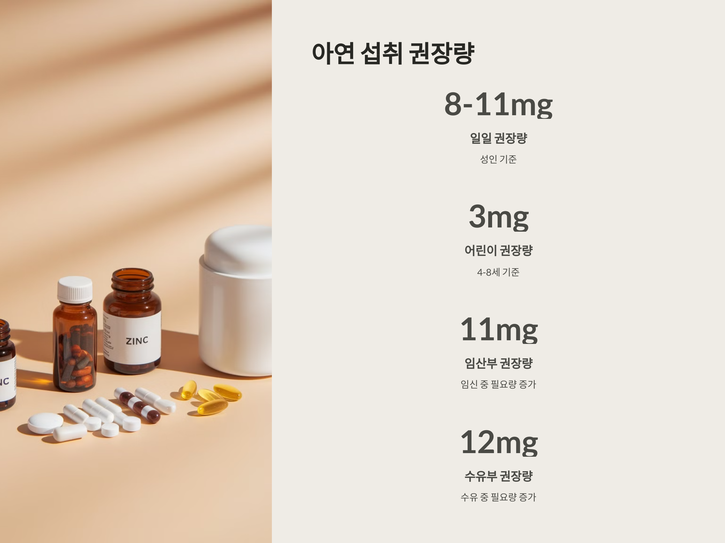 일반적인 성인의 경우 하루 아연 섭취 권장량은 약 8~11mg입니다. 그러나 아연 결핍이 의심될 경우, 의사와 상담을 통해 적절한 보충량을 결정하는 것이 좋습니다. 지나치게 많은 아연을 섭취하면 체내의 구리 농도를 저하시킬 수 있으므로, 섭취량을 조절하는 것이 중요합니다.