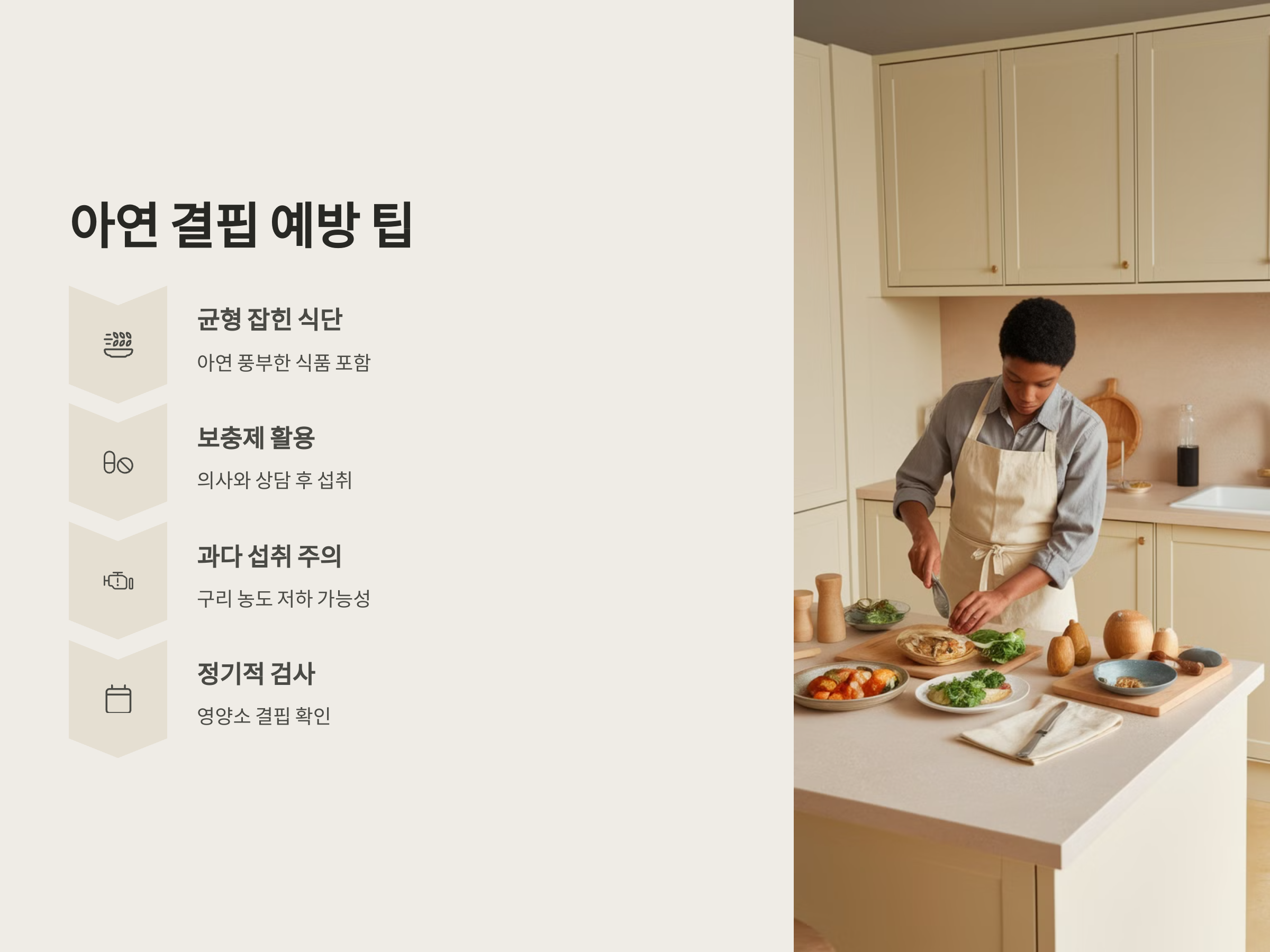 아연 결핍을 예방하기 위해서는 아연이 풍부한 식품을 일상적인 식단에 포함시키는 것이 가장 좋습니다. 육류나 해산물을 자주 섭취할 수 있다면 아연을 자연스럽게 보충할 수 있습니다. 채식주의자라면 아연이 풍부한 식물성 식품인 렌즈콩, 병아리콩, 호박씨 등을 적극적으로 섭취하는 것이 좋습니다.