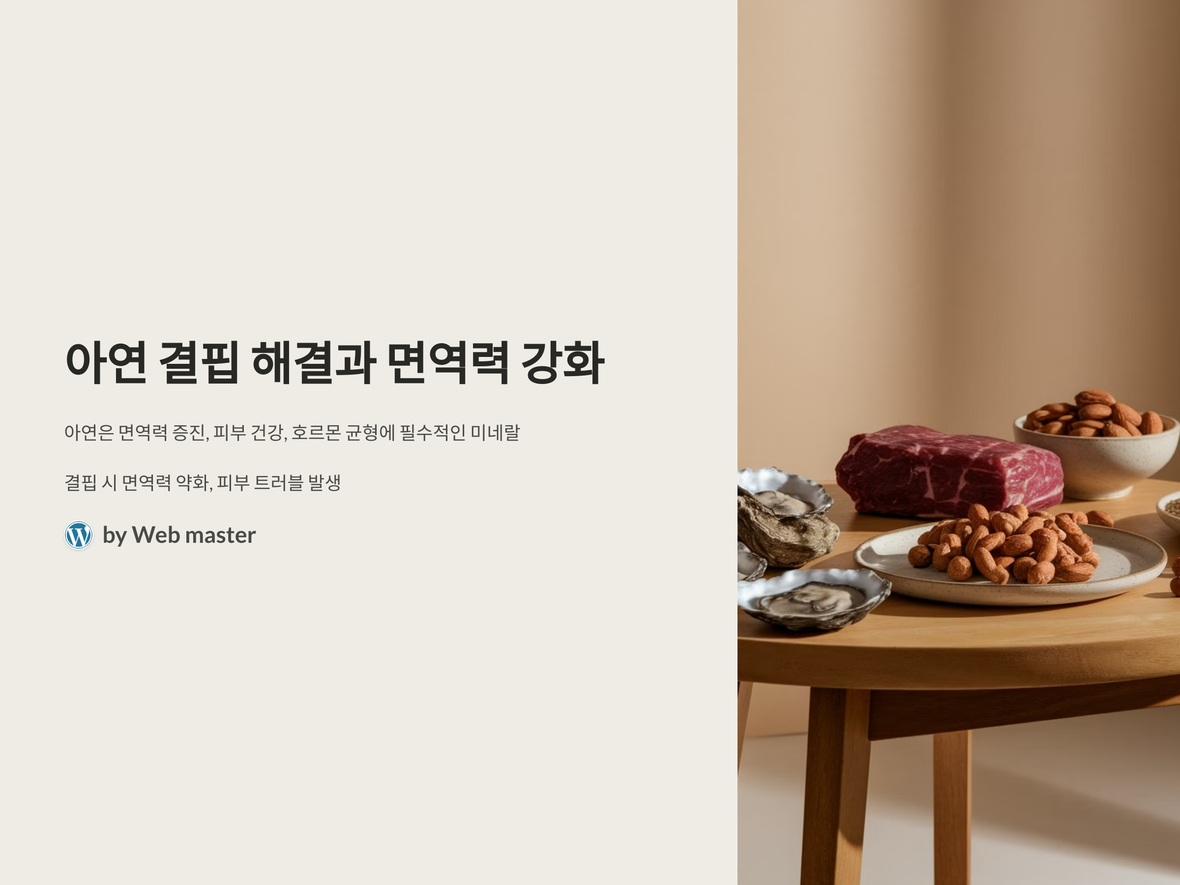 아연은 우리 몸에서 중요한 역할을 하는 미네랄로, 면역력 증진, 피부 건강, 호르몬 균형을 유지하는 데 필수적입니다. 아연이 부족하면 면역력이 약화되고, 피부 트러블이나 다양한 건강 문제가 발생할 수 있습니다. 본 글에서는 아연 결핍을 해결하고 면역력을 강화하며 피부 건강을 유지하는 방법에 대해 알아보겠습니다. 이를 통해 아연의 중요성을 더욱 잘 이해하고, 일상에서 어떻게 아연을 섭취할 수 있을지에 대해 구체적으로 다루겠습니다.