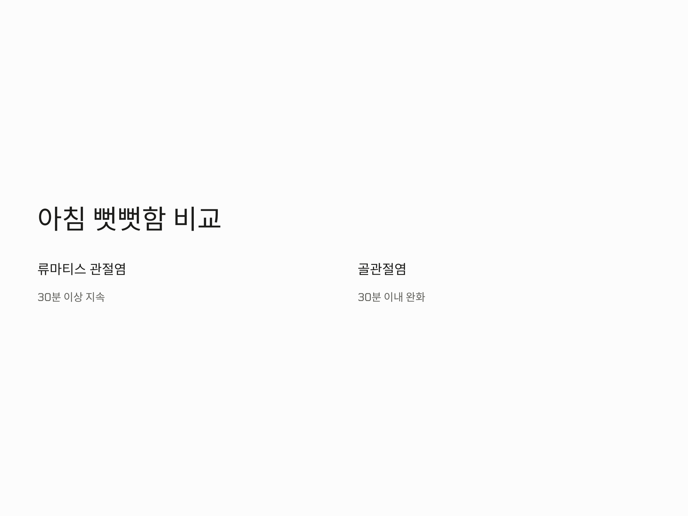 - 통증의 증가: 골관절염은 염증보다는 연골 손상으로 인해 통증이 발생합니다. 아침에는 뻣뻣함과 함께 약간의 불편함이 있을 수 있지만, 활동을 시작하면 통증이 완화되는 경우가 많습니다.