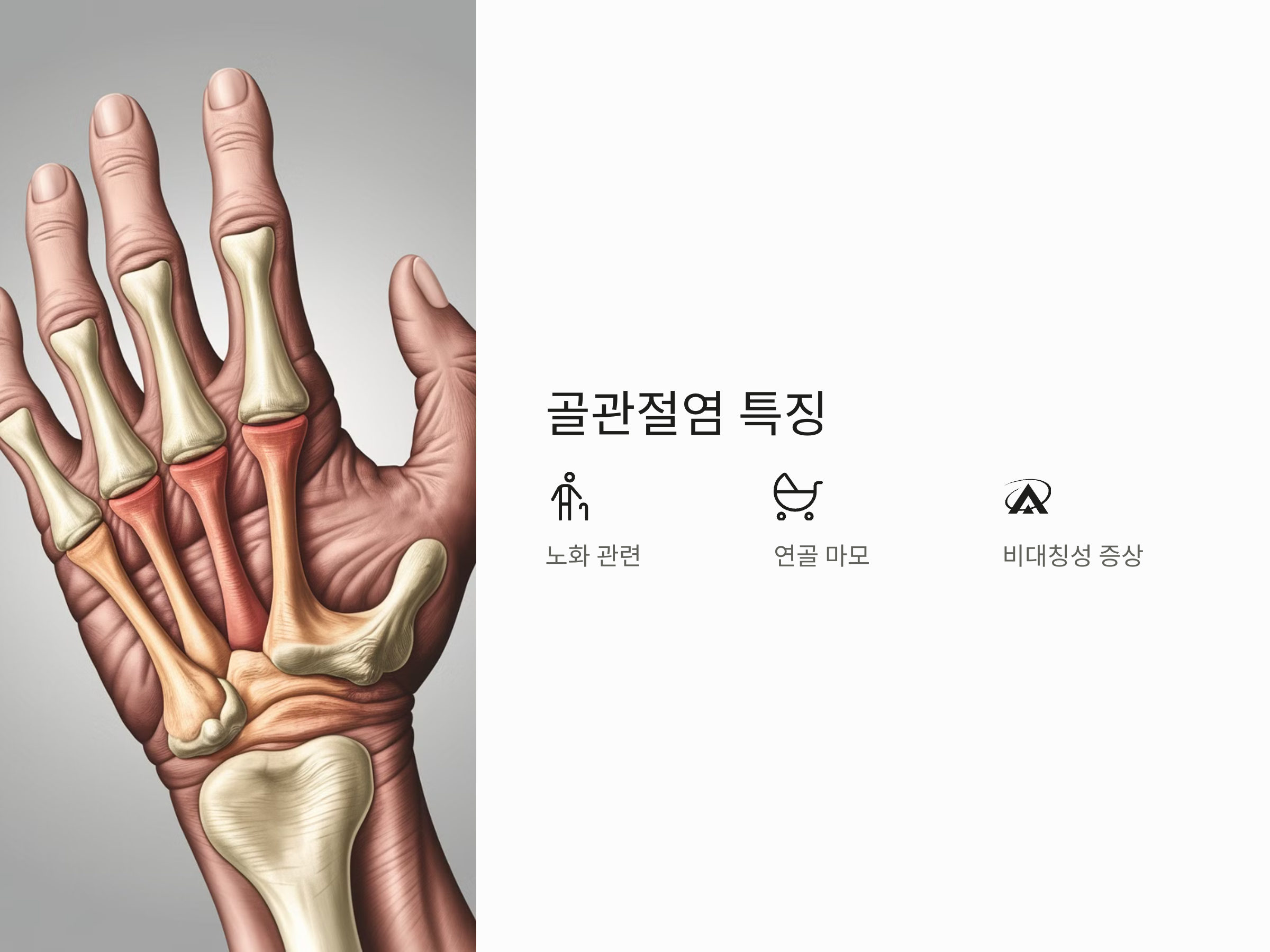 골관절염(Osteoarthritis, OA)은 주로 노화와 과도한 사용으로 발생하는 퇴행성 관절 질환입니다. 관절을 구성하는 연골이 손상되어 마모되면서 발생하며, 손목이나 손가락 관절이 뻣뻣해지는 증상도 나타날 수 있습니다. 골관절염은 류마티스 관절염과 달리 염증보다는 연골의 마모와 관련이 깊습니다.