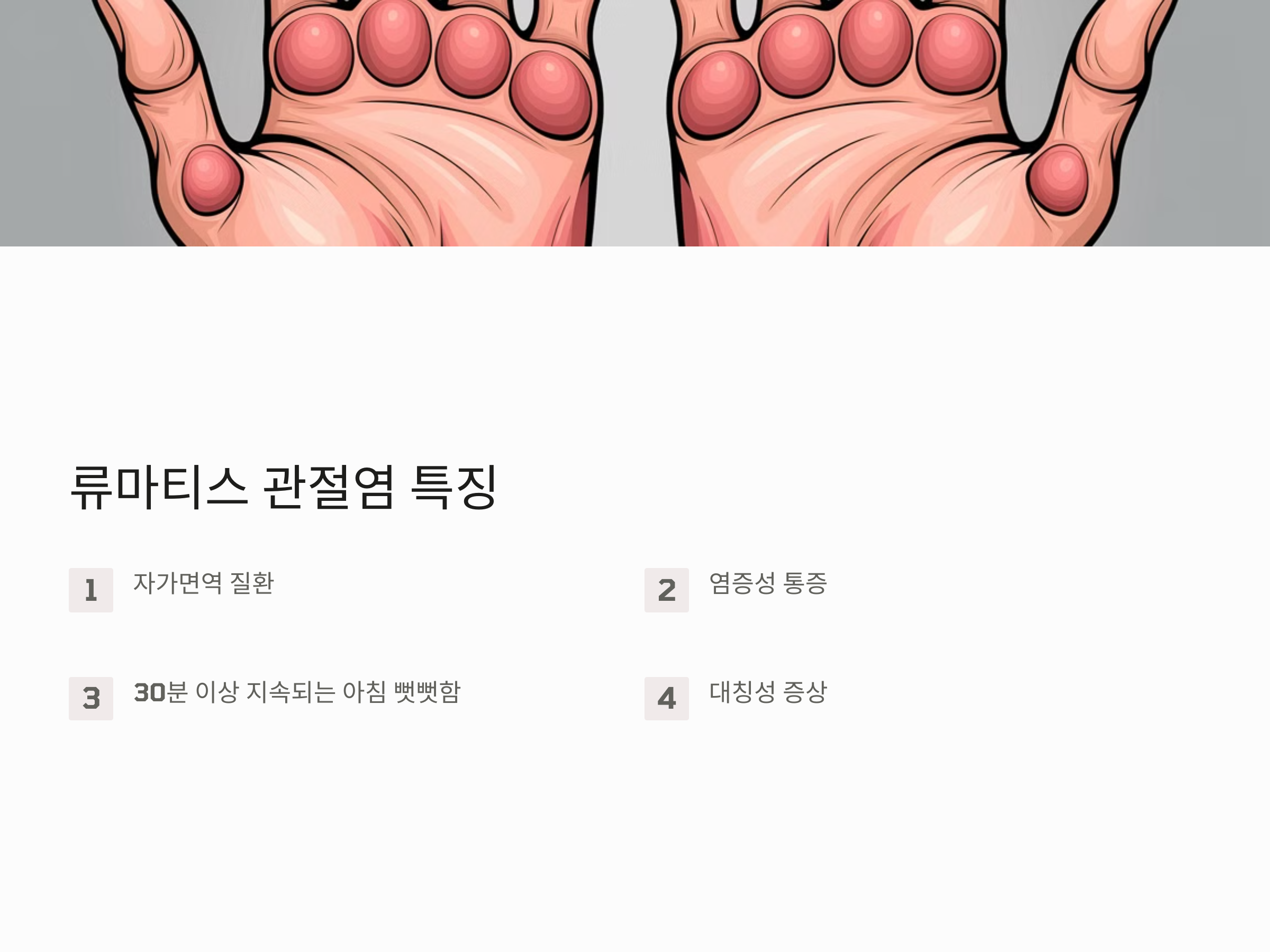 - 아침 뻣뻣함: 아침에 일어나면 손가락 관절에 뻣뻣함이 나타나며, 이 증상은 일반적으로 30분 이상 지속됩니다.