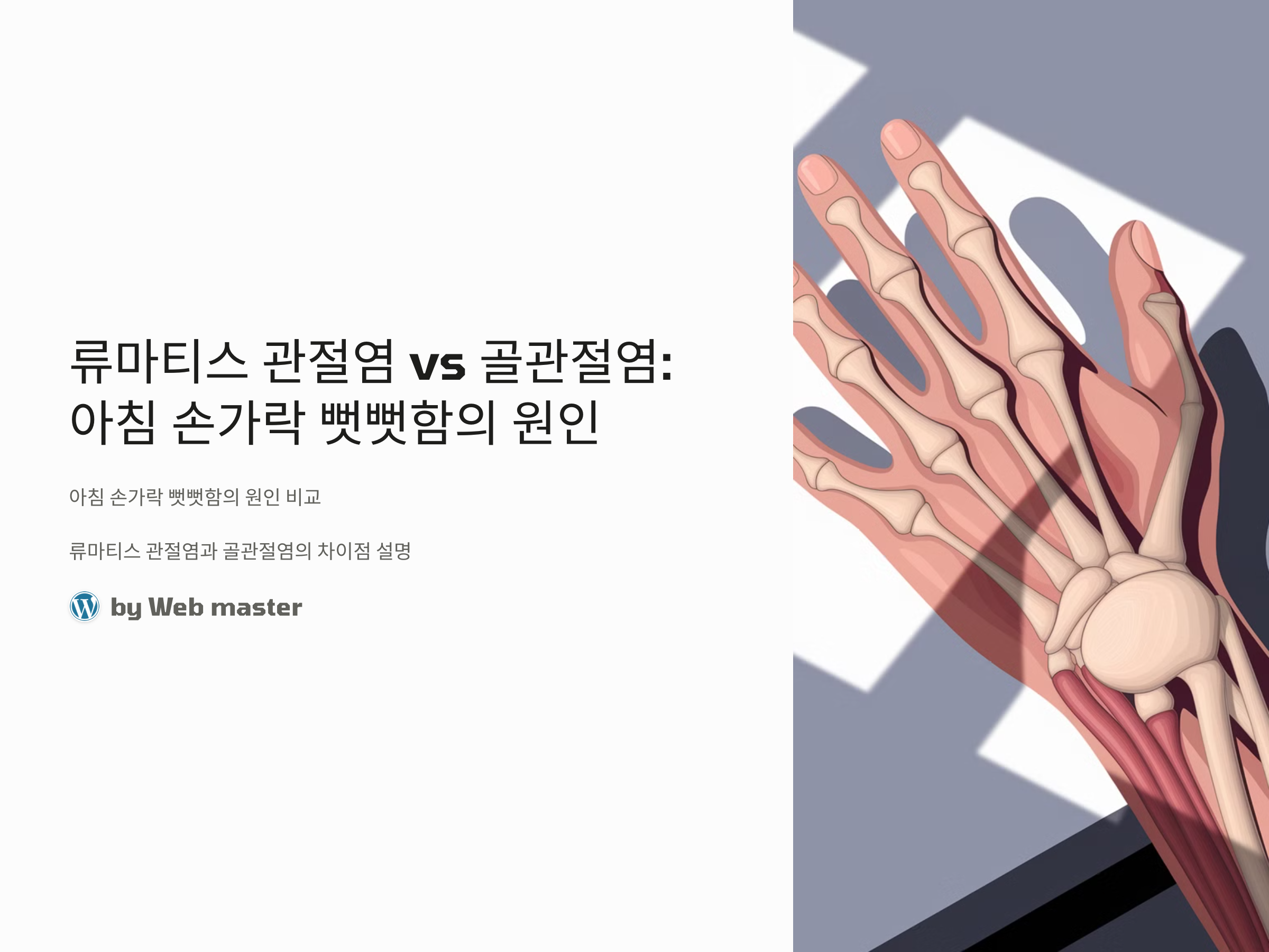 류마티스 관절염과 골관절염은 모두 손가락에 뻣뻣함을 일으킬 수 있는 질환이지만, 그 원인과 치료 방법은 매우 다릅니다. 류마티스 관절염은 염증에 의해 발생하는 자가면역 질환으로, 아침에 손가락이 뻣뻣하고 붓는 증상이 30분 이상 지속됩니다. 반면, 골관절염은 연골의 퇴화로 인해 관절이 마모되고 통증이 발생하는 퇴행성 질환으로, 아침의 뻣뻣함은 짧은 시간 내에 개선되는 경향이 있습니다.