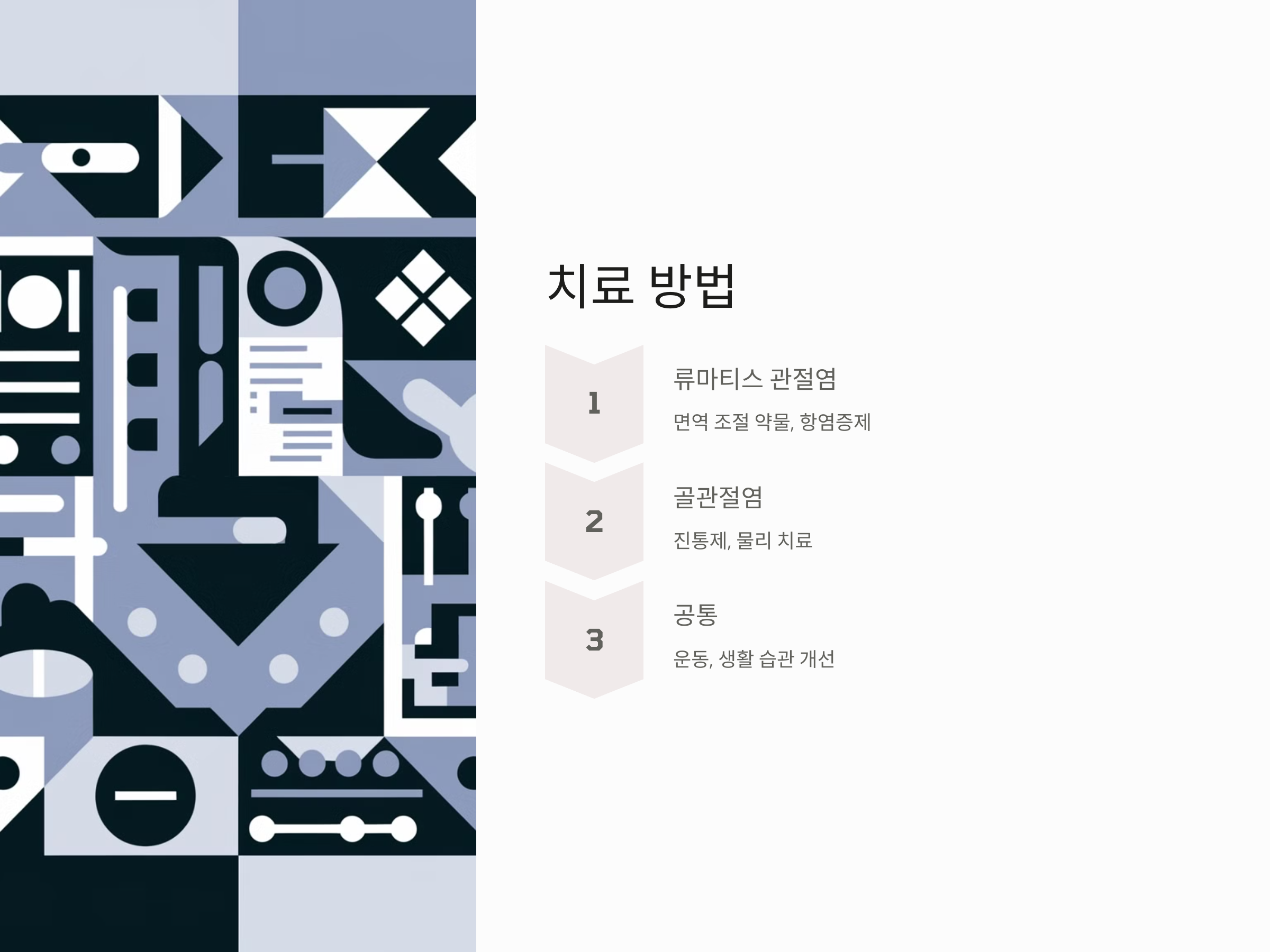 - 면역 억제제: DMARDs(질병 수정 항류마티스 약물)나 생물학적 제제를 사용해 면역 시스템의 공격을 억제합니다.