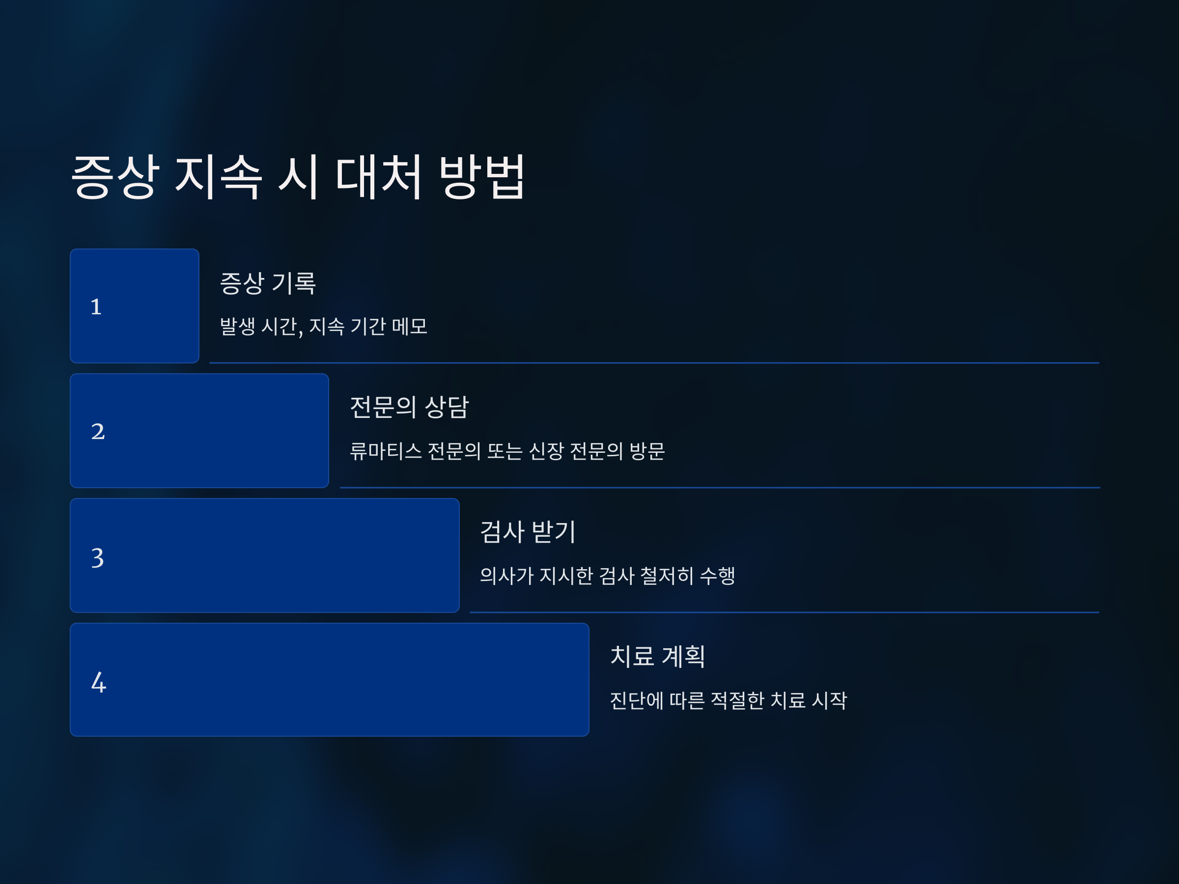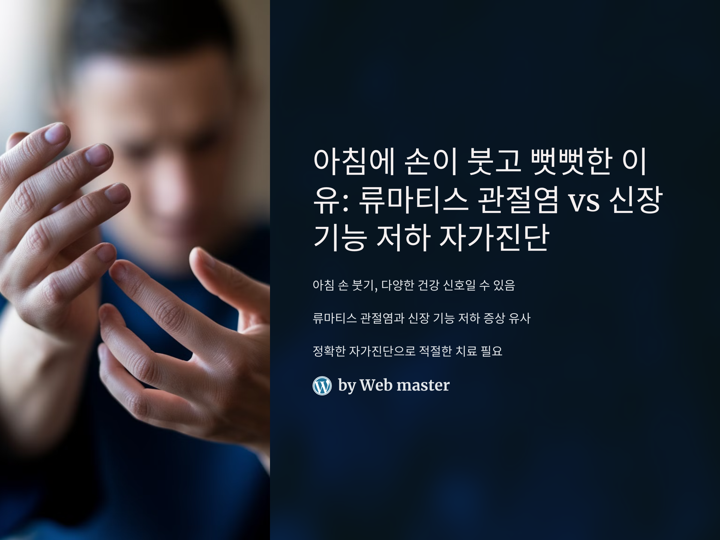 아침에 손이 붓고 뻣뻣한 증상은 단순한 피로에서 비롯될 수도 있지만, 류마티스 관절염이나 신장 기능 저하와 같은 질환의 신호일 수 있습니다. 두 질환 모두 초기에는 유사한 증상을 보일 수 있기 때문에, 증상이 지속된다면 전문가의 진료를 받는 것이 중요합니다. 자가진단으로 큰 틀을 잡고, 건강 관리와 예방에 적극적으로 나서는 것이 중요합니다.