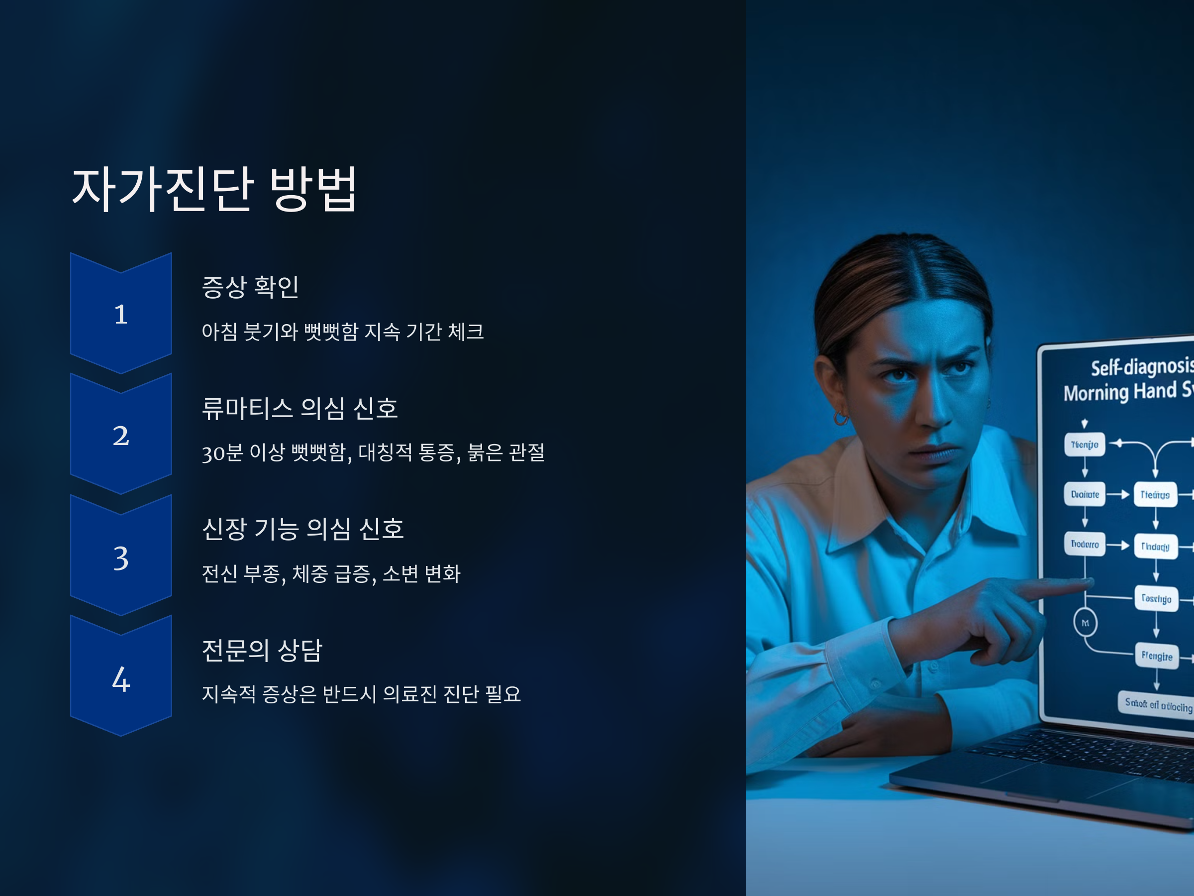 아침에 손이 붓고 뻣뻣한 증상이 지속된다면, 자가진단을 통해 어느 정도 원인을 파악할 수 있습니다. 그러나 최종 진단은 반드시 전문 의료진을 통해 받는 것이 중요합니다. 자가진단 방법은 다음과 같습니다: