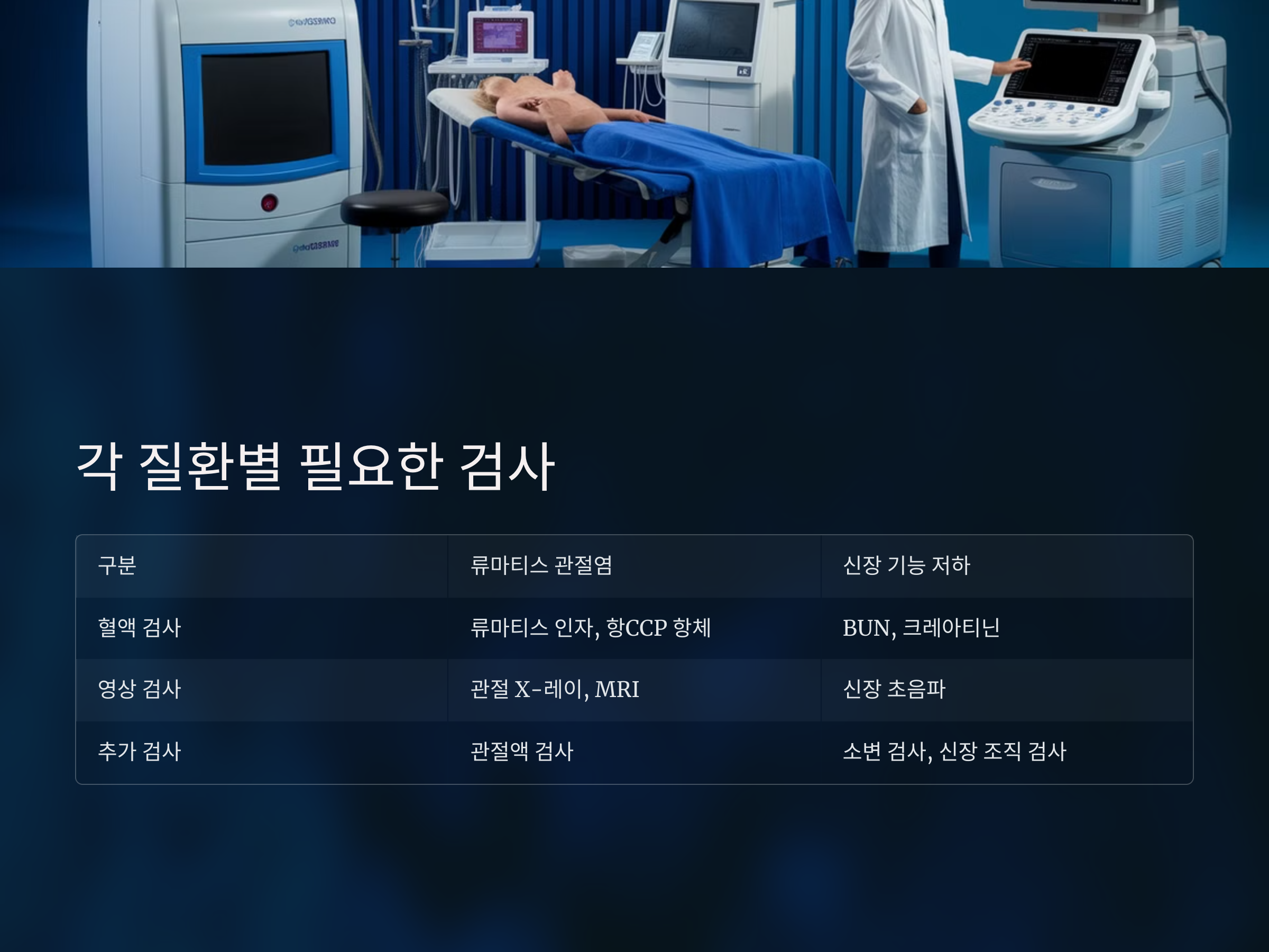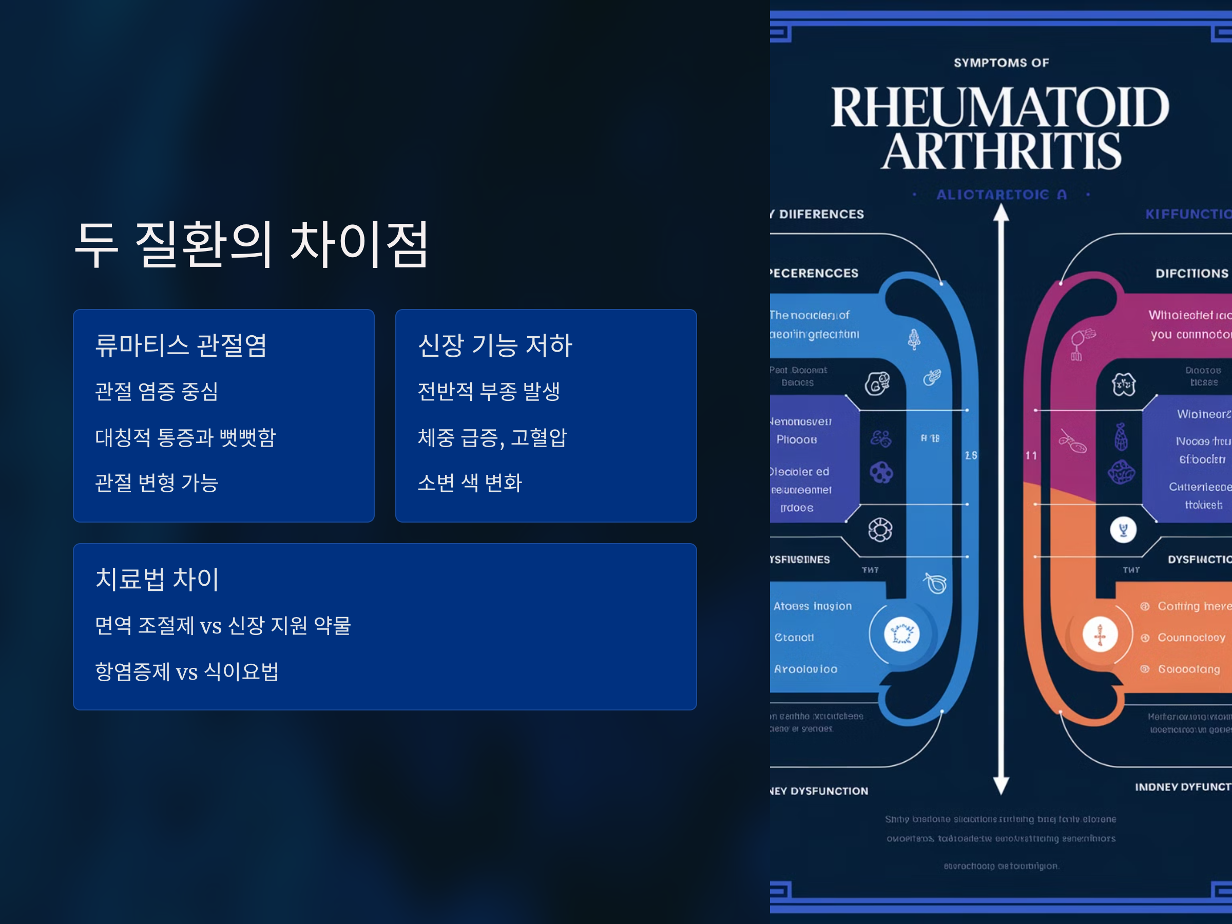 이 두 질환은 또한 치료 방법에서도 차이가 있습니다. 류마티스 관절염은 면역 억제제나 항염증제를 사용해 치료하며, 신장 기능 저하는 신장 기능을 지원하는 약물 치료와 함께 식이 요법, 체액 관리가 필요합니다.