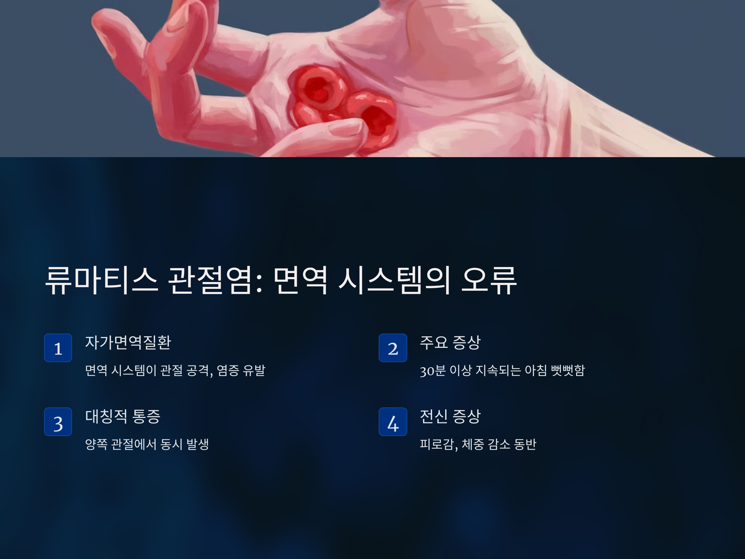 류마티스 관절염은 자가 면역 질환으로, 면역 시스템이 자신의 관절을 공격하여 염증을 일으키는 질환입니다. 아침에 손이나 손목, 무릎 등 관절이 붓고 뻣뻣한 증상을 보이는 것이 특징입니다. 일반적으로 30분 이상 지속되는 뻣뻣함과 붓기가 동반되며, 점차적으로 손가락 관절에 통증이 심해집니다. 또한, 류마티스 관절염은 시간이 지남에 따라 관절의 변형을 초래할 수 있습니다.