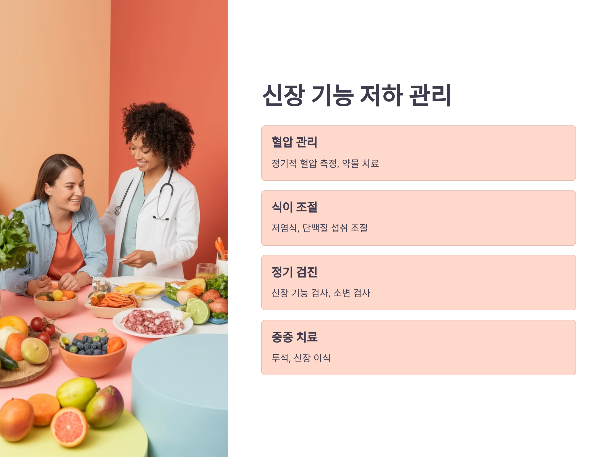 반면, 신장 기능 저하는 생활 습관을 개선하고, 신장에 부담을 줄 수 있는 요소들을 제거하는 것이 중요합니다. 혈압 관리, 당뇨 관리, 그리고 염분 섭취를 줄이는 것이 신장 기능 저하를 예방하는 데 도움을 줄 수 있습니다. 신장 기능이 이미 저하된 경우, 약물 치료와 더불어 투석이나 신장 이식이 필요한 경우도 있습니다.