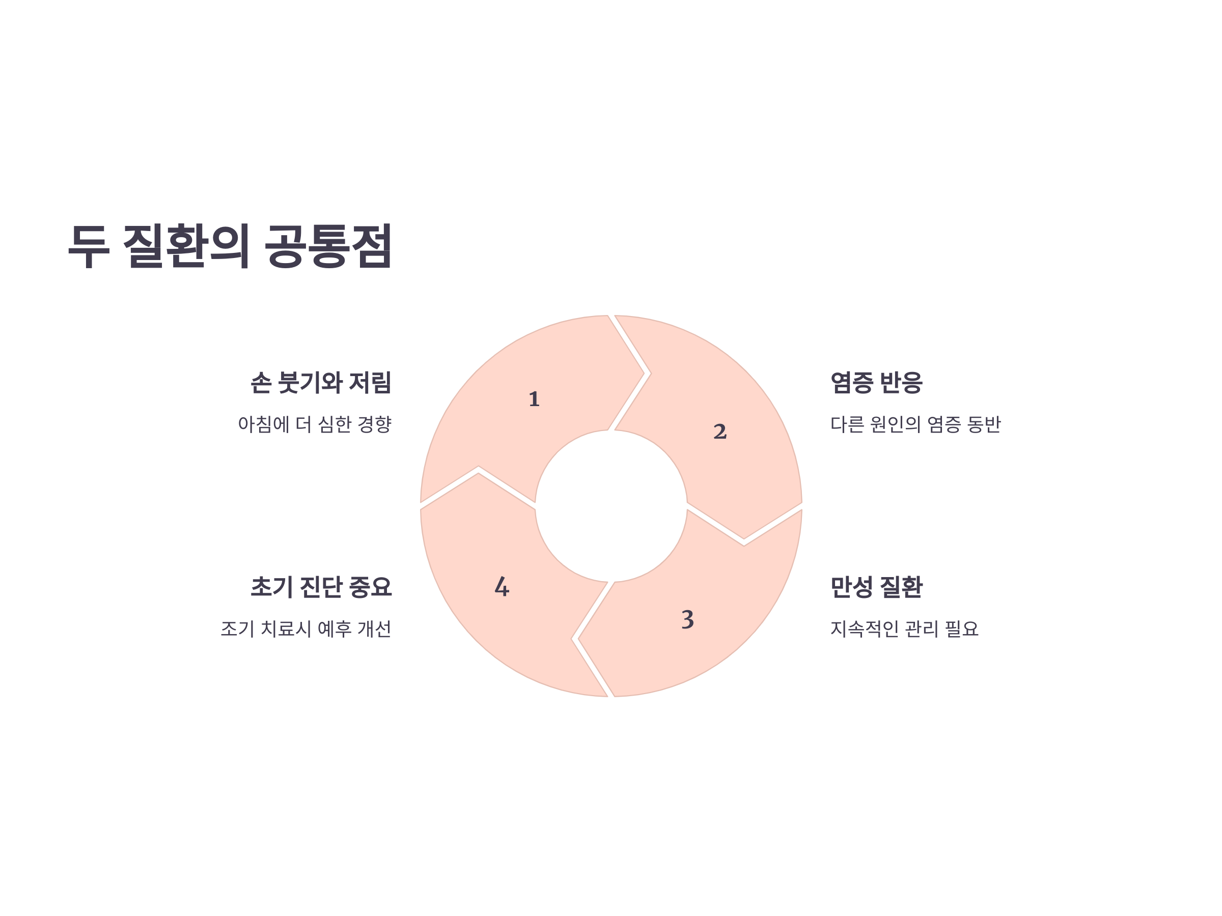 두 질환 모두 만성적인 경과를 보일 수 있기 때문에, 초기에 발견하고 치료를 시작하는 것이 장기적인 건강을 지키는 데 중요한 역할을 합니다. 아침에 손이 붓고 저린 증상이 있다면, 이를 단순한 피로나 스트레스로 치부하지 말고, 전문가와 상담하여 적절한 치료를 받는 것이 중요합니다.