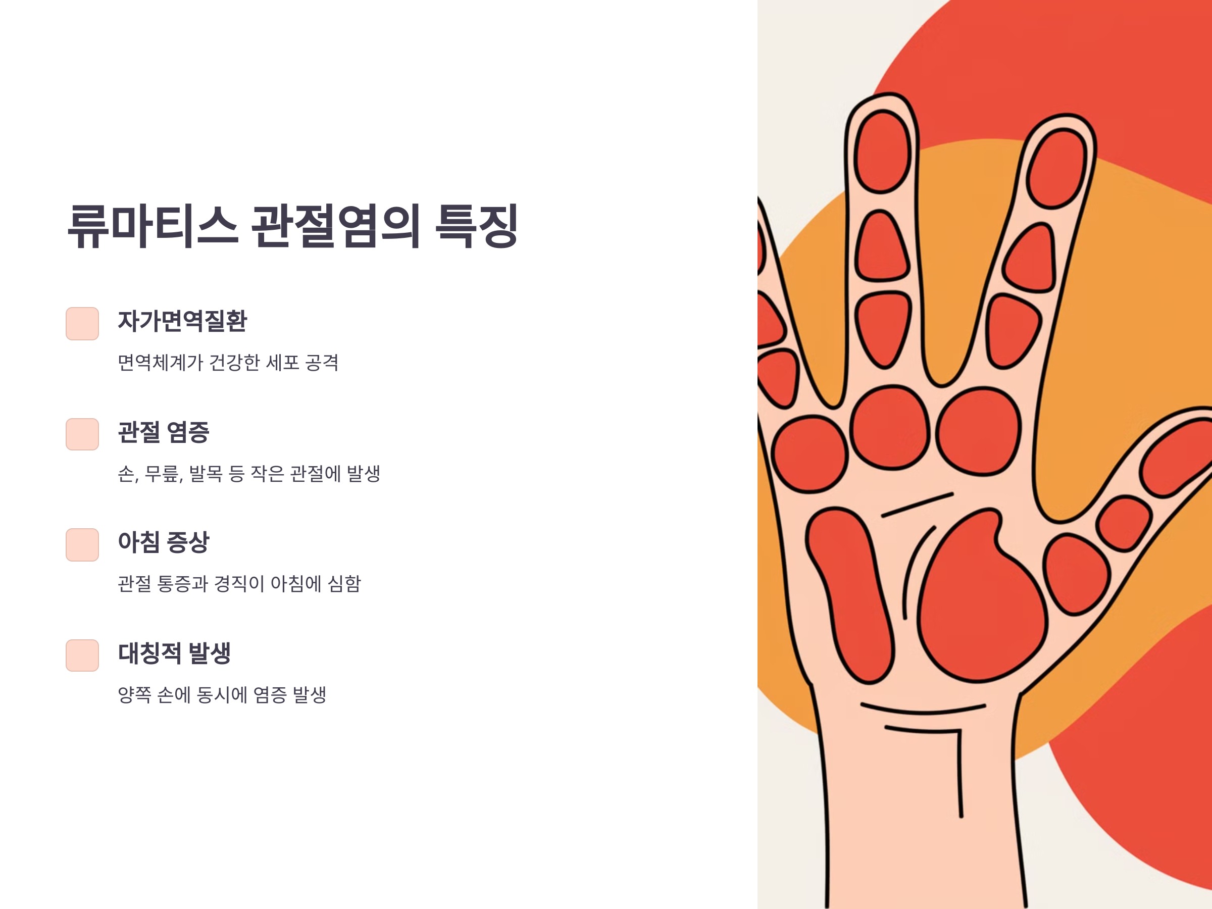 류마티스 관절염은 자가면역질환으로, 면역 체계가 자신의 건강한 세포를 공격해 관절에 염증을 일으키는 질환입니다. 이 질환은 보통 손, 무릎, 발목 등 작은 관절에서 주로 발생하며, 아침에 일어나면 손이 붓고 관절이 뻣뻣해지는 증상을 겪습니다. 특히 아침에 일어나면 관절의 통증과 경직이 더 심해지며, 시간이 지나면서 점차 개선되는 경향이 있습니다.