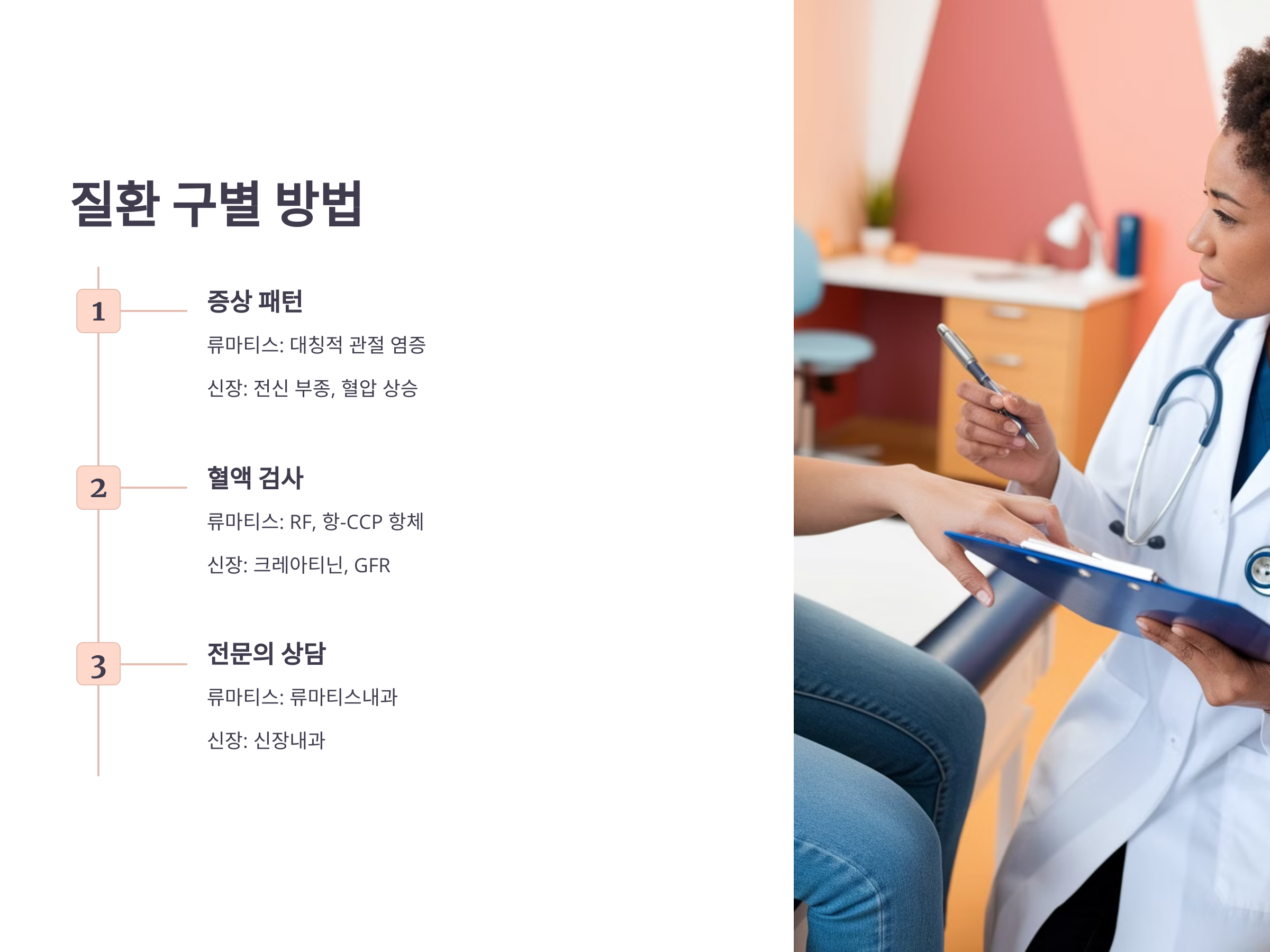 류마티스 관절염은 면역 체계의 과도한 반응으로 발생하는 자가면역질환이라면, 신장 기능 저하는 신장의 여과 기능 저하로 인해 발생하는 질환입니다. 이 때문에 두 질환을 구분할 때는 증상뿐만 아니라 혈액 검사나 소변 검사 등의 추가적인 진단이 필요합니다.