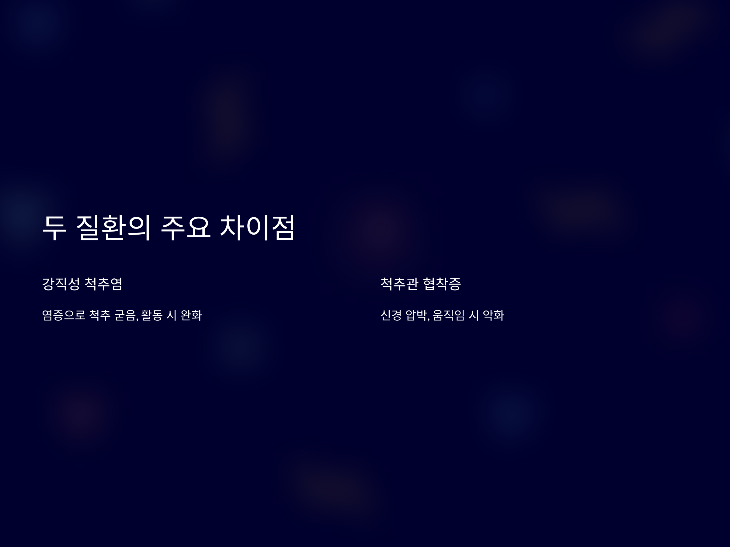 - 강직성 척추염은 염증에 의해 척추 자체가 굳어지며, 활동 시 통증이 완화되는 반면, 척추관 협착증은 신경이 압박되면서 움직임에 제약을 주고, 걷거나 서 있을 때 증상이 심해집니다.