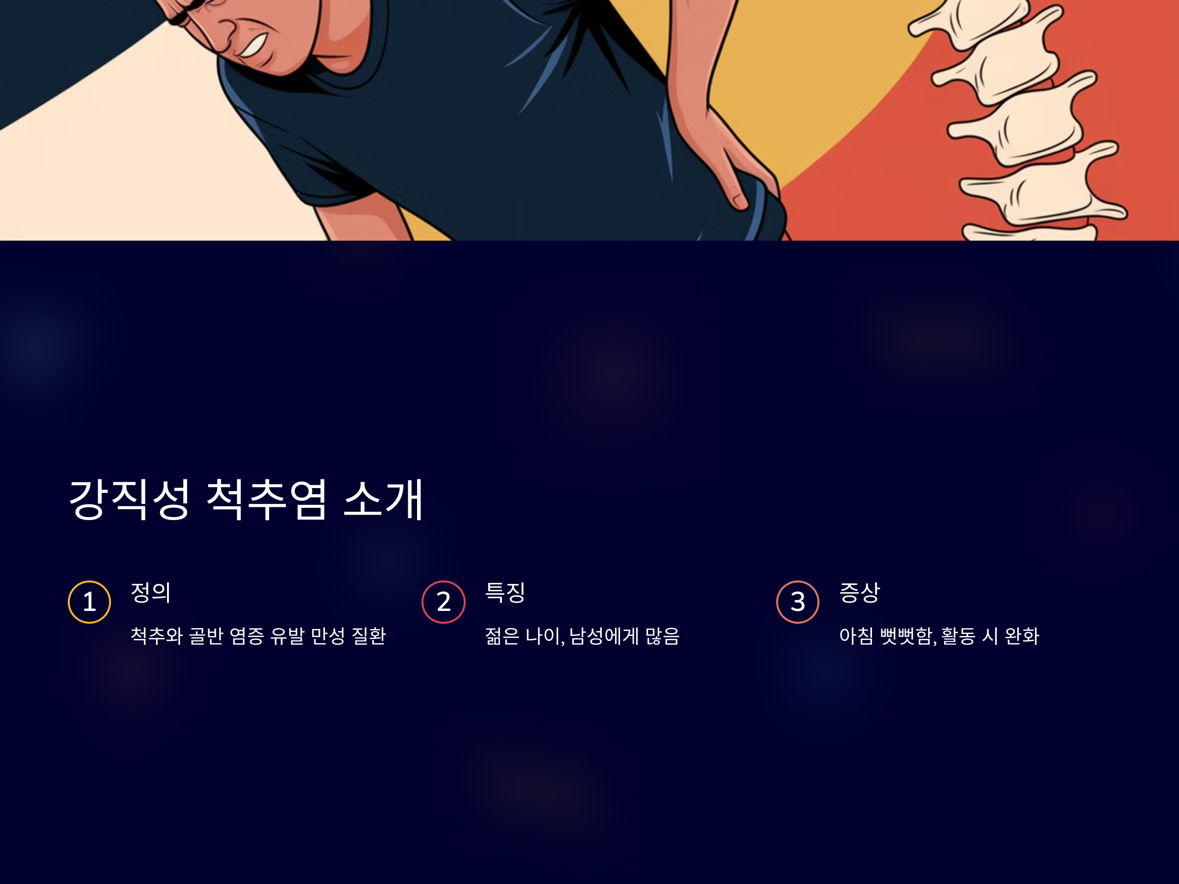 - 강직성 척추염은 주로 젊은 연령층에서 발생하며, 아침에 더 심한 통증을 경험합니다. 운동으로 증상이 개선되는 경향이 있습니다.