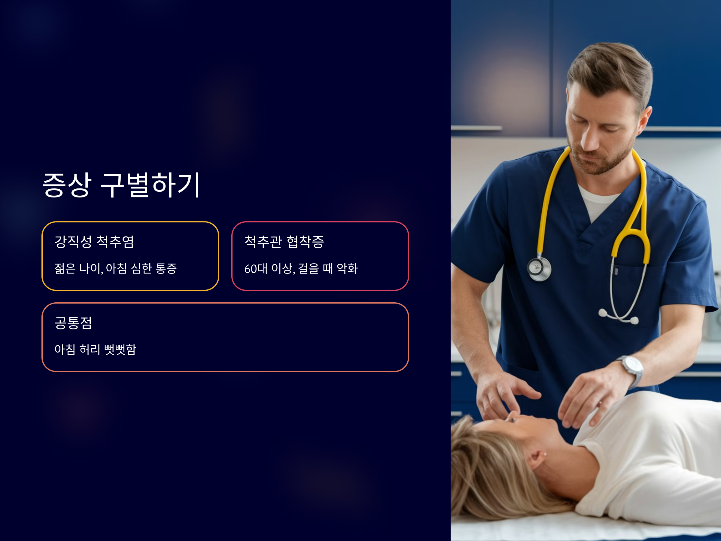 아침에 허리가 뻣뻣하고 움직이기 힘든 증상은 강직성 척추염과 척추관 협착증 모두에서 나타날 수 있습니다. 하지만 다음과 같은 특징을 고려하면, 보다 정확한 진단을 내릴 수 있습니다.
