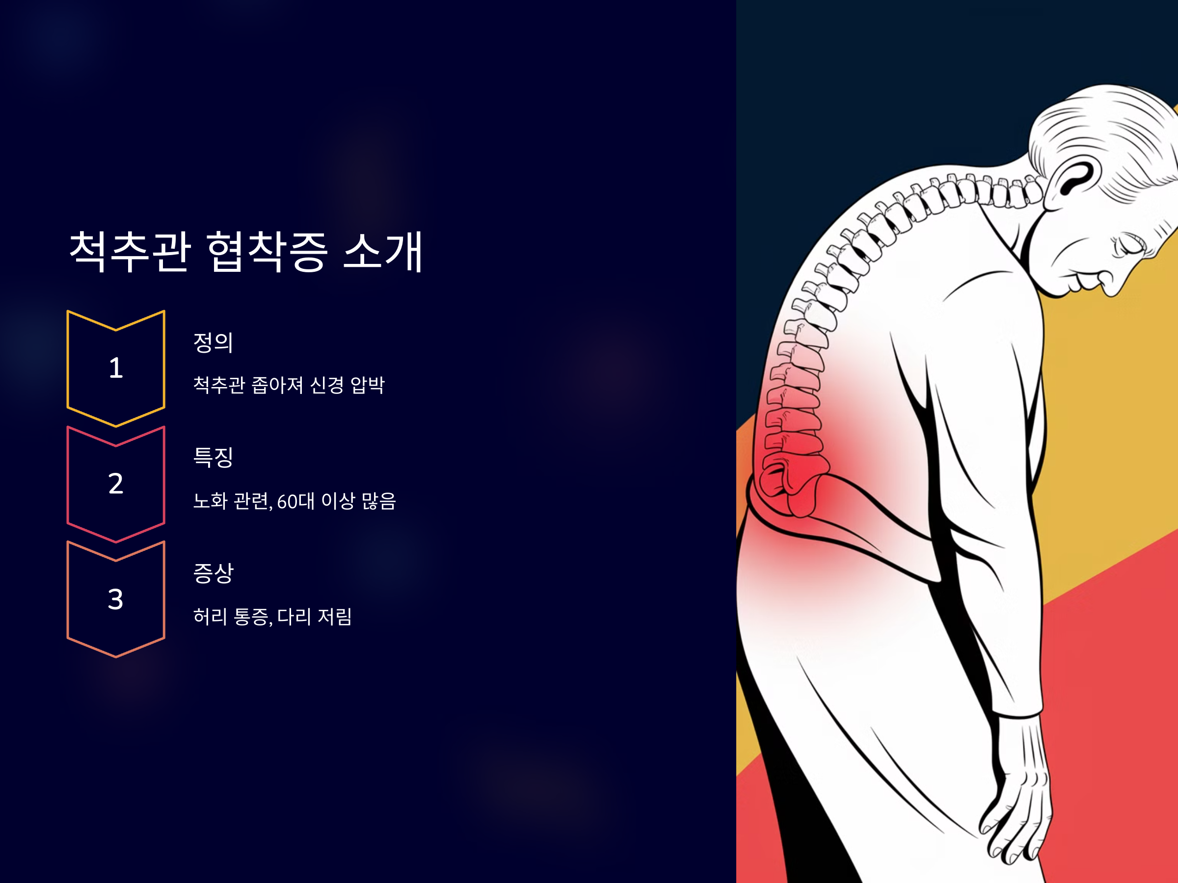 척추관 협착증(Spinal Stenosis)은 척추의 신경이 지나가는 통로인 척추관이 좁아져서 신경을 압박하게 되는 질환입니다. 이 질환은 주로 노화와 관련이 있으며, 60대 이상에서 많이 나타납니다. 척추관 협착증은 허리 통증과 다리 저림, 둔한 통증이 특징적입니다. 특히 아침에는 허리가 뻣뻣하고 아픈 증상이 나타나지만, 오래 서 있거나 걷는 시간이 길어지면 증상이 악화되고, 앉거나 구부리면 증상이 완화되는 특징이 있습니다.