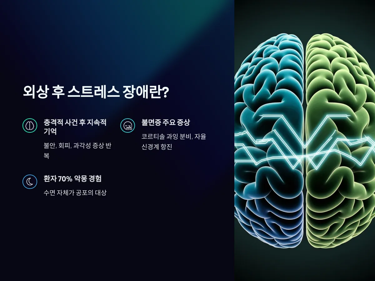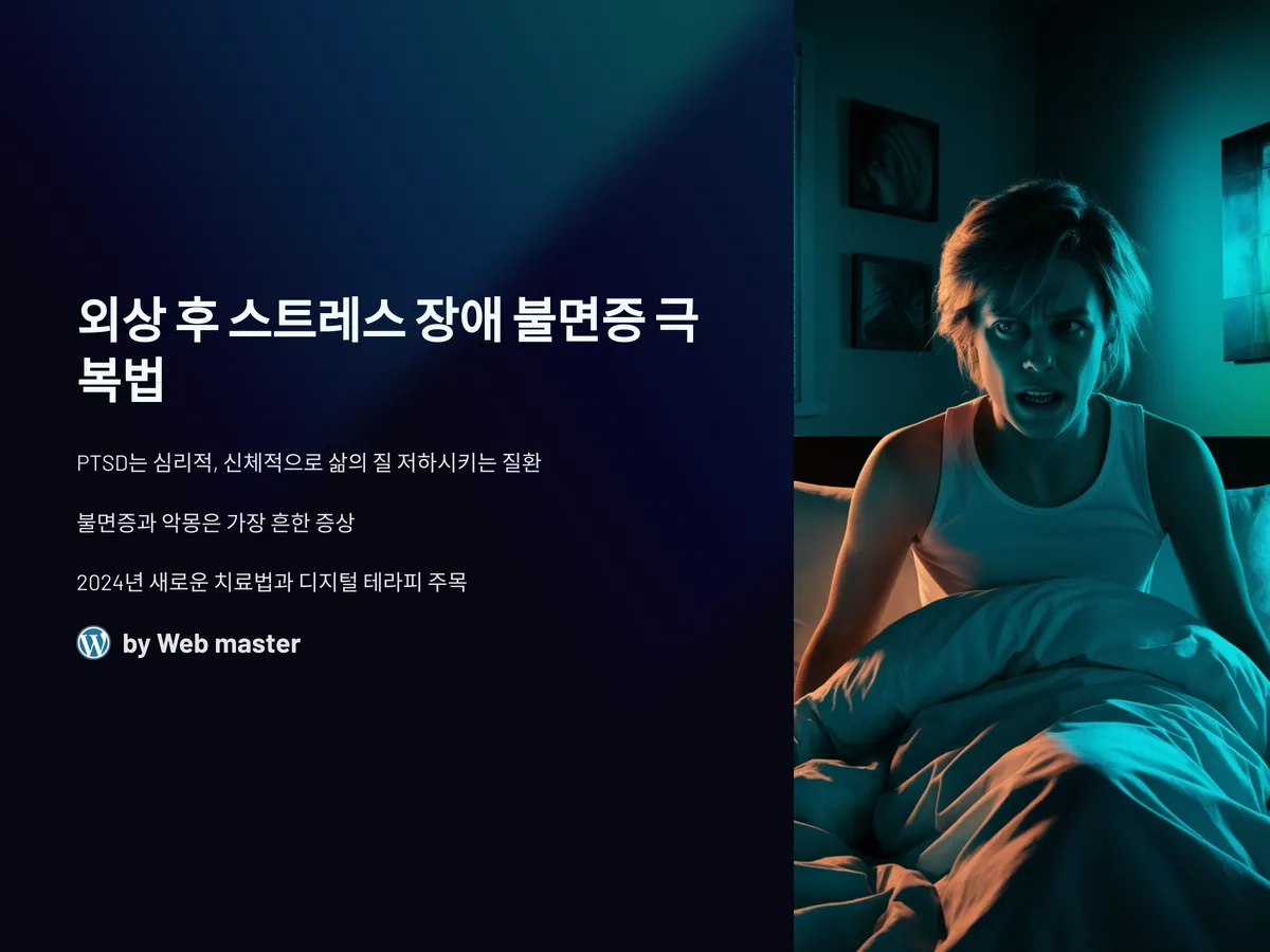 외상 후 스트레스 장애(PTSD)는 단순한 심리적 충격을 넘어 생리적, 신체적으로도 삶의 질을 크게 저하시킬 수 있는 질환입니다. 특히 불면증과 반복적인 악몽은 PTSD 환자들이 가장 많이 호소하는 증상 중 하나로, 매일 밤이 공포의 시간으로 변하는 현실은 상상 이상으로 고통스럽습니다. 2024년을 기점으로 PTSD 환자를 위한 새로운 치료법과 디지털 테라피가 주목받고 있으며, AI를 활용한 수면 모니터링 솔루션이나 VR 기반 치료 기법이 점차 확대되고 있습니다.