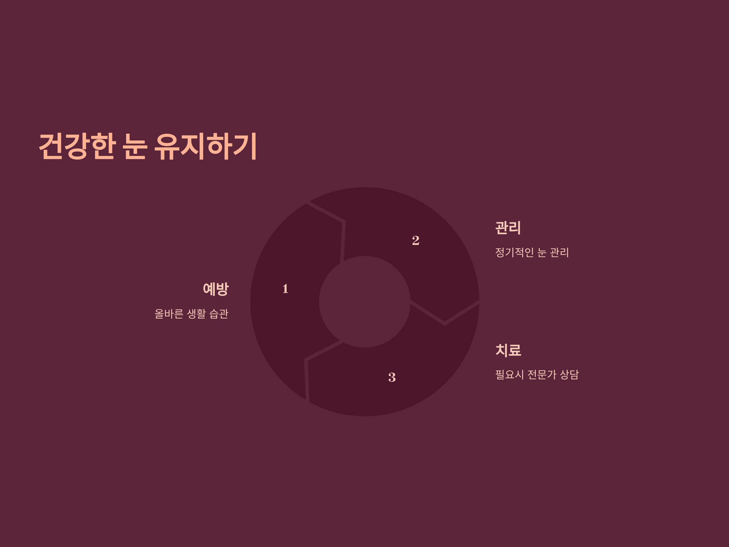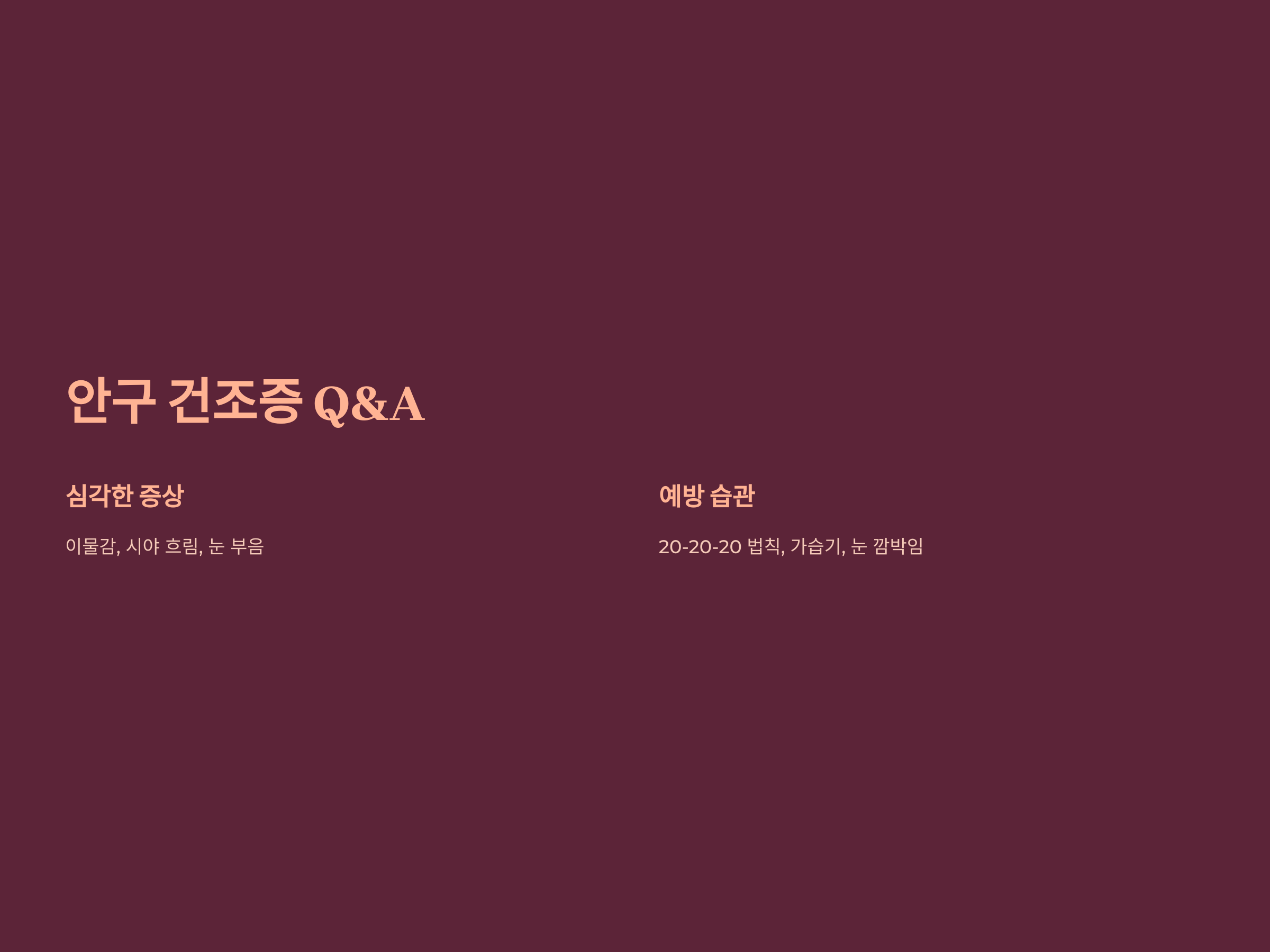 안구 건조증은 일시적인 불편함으로 끝나지 않습니다. 증상이 심해지면 눈 건강에 큰 영향을 미칠 수 있기 때문에, 초기 증상이 나타났을 때 빠르게 관리하는 것이 중요합니다. 디지털 기기 사용, 환경 관리, 그리고 올바른 생활 습관을 통해 안구 건조증을 예방하고, 눈 건강을 지켜나가세요. 만약 증상이 지속된다면, 전문가와 상담하여 적절한 치료를 받는 것이 가장 중요합니다.