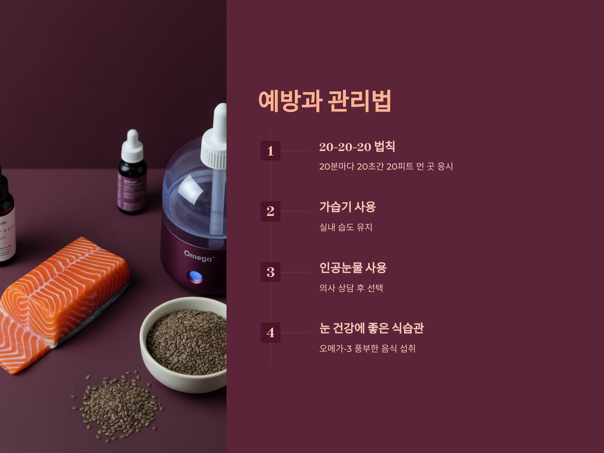 안구 건조증을 예방하고 관리하기 위해서는 몇 가지 습관을 들이는 것이 중요합니다. 작은 변화로도 큰 효과를 볼 수 있습니다. 여기에는 생활 습관, 식습관, 그리고 주변 환경을 조정하는 방법이 포함됩니다.