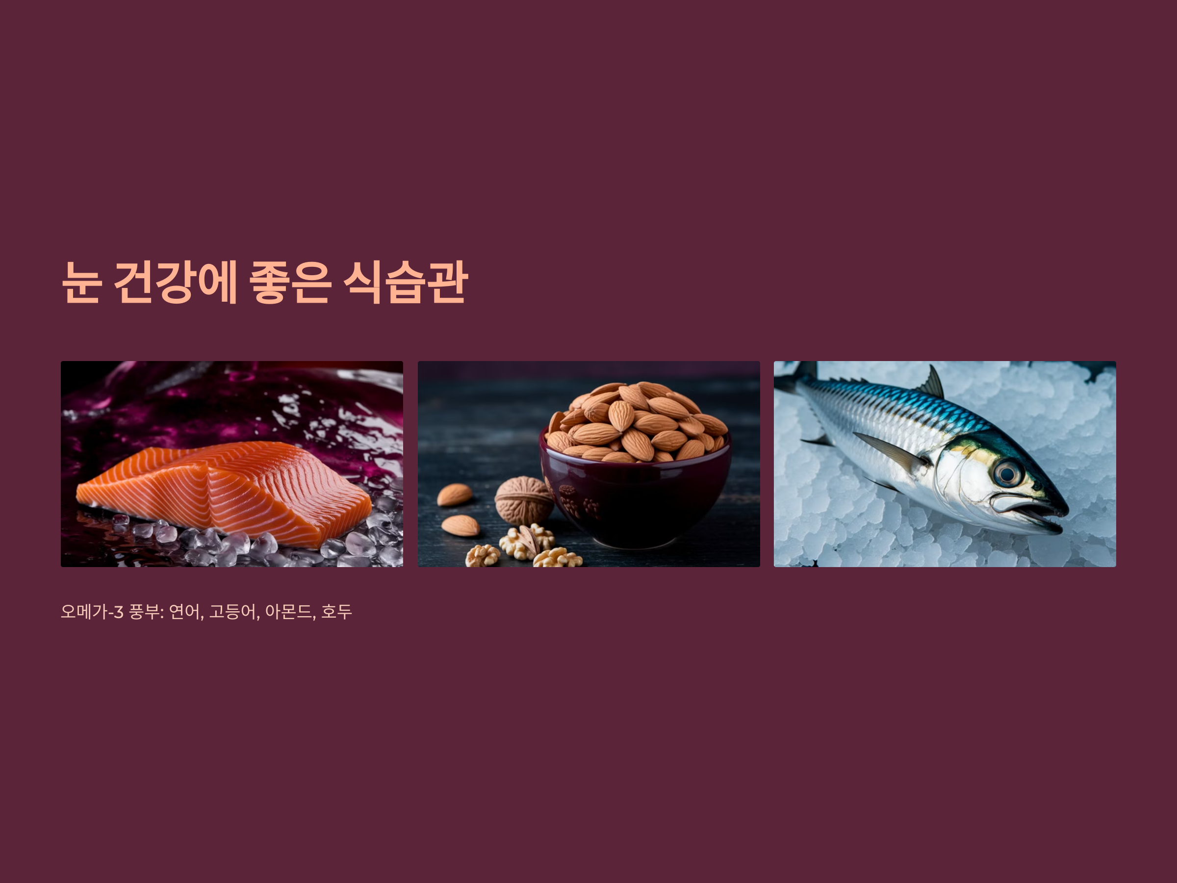 오메가-3 지방산이 풍부한 음식을 섭취하면 눈물 분비를 촉진할 수 있습니다. 특히, 연어, 고등어, 아몬드, 호두 등은 오메가-3가 풍부한 식품으로 추천됩니다.
