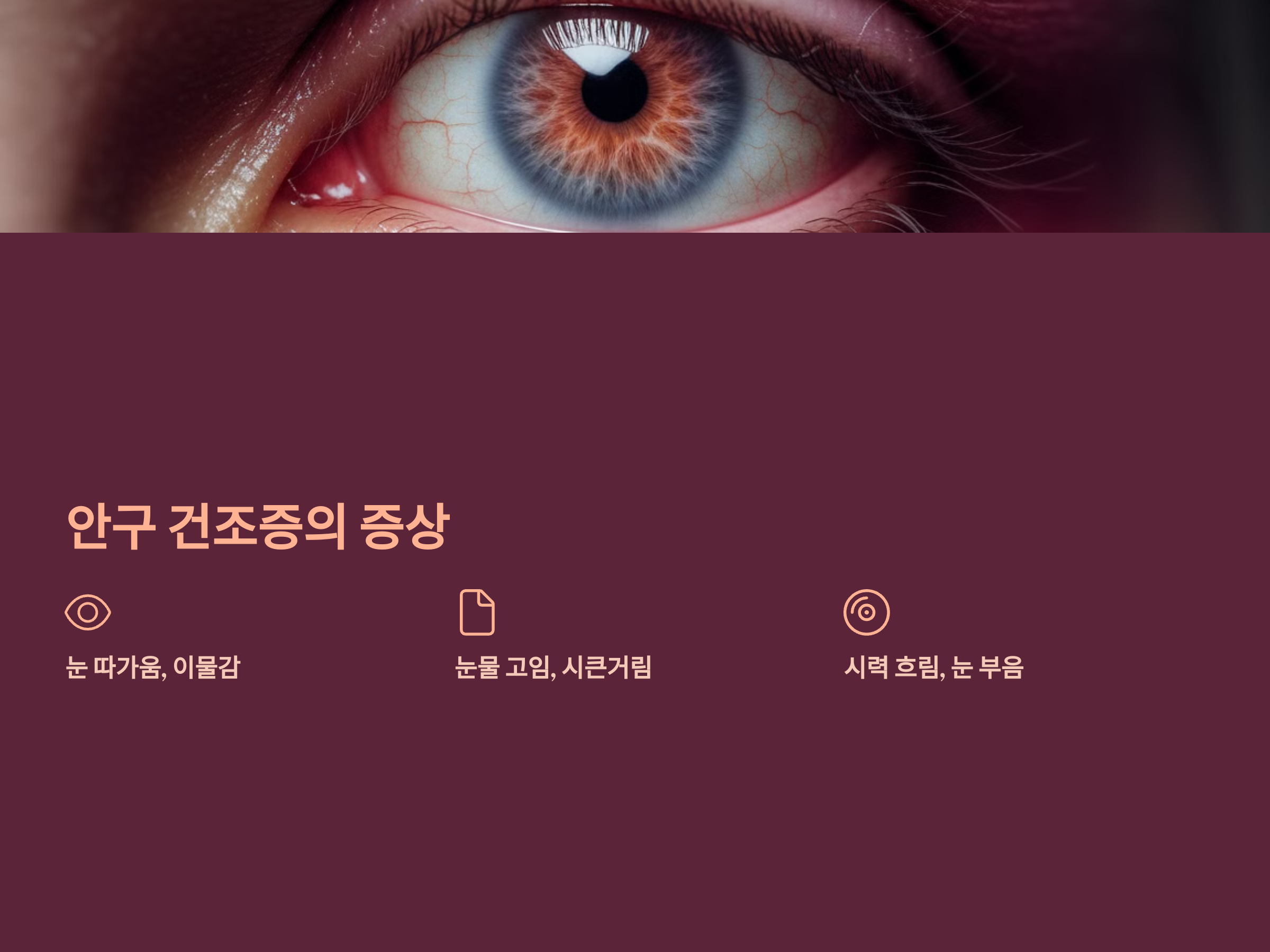 A1: 안구 건조증이 심해지면 눈에 이물감이 느껴지고, 시야가 흐려지거나 눈이 자주 붓는 증상이 나타날 수 있습니다. 이런 증상이 지속되면 다른 눈 질환으로 발전할 위험이 있습니다.