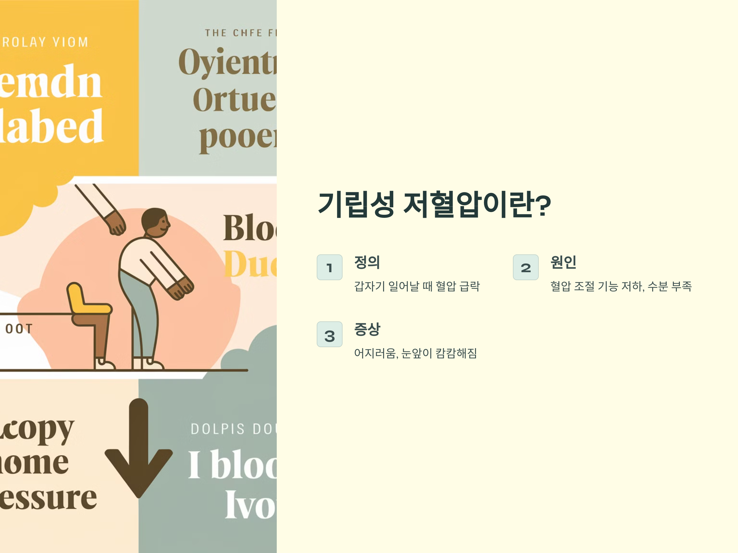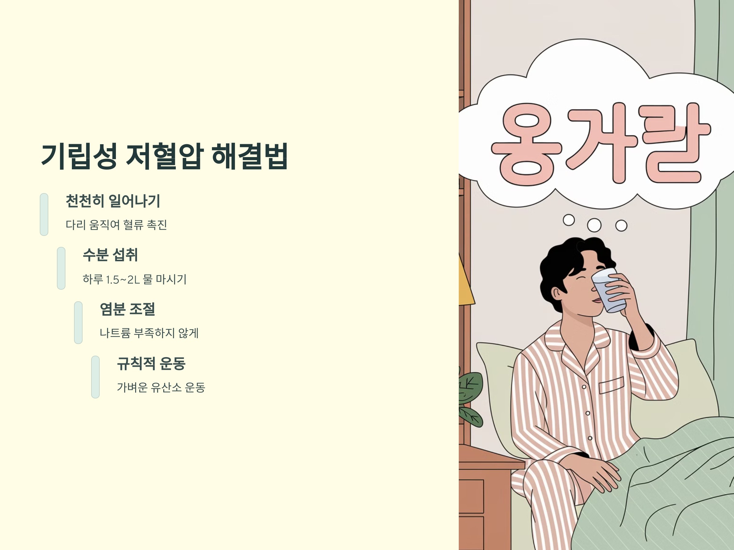 기립성 저혈압(Orthostatic Hypotension)이란 앉아 있거나 누워 있다가 갑자기 일어날 때 혈압이 급격히 떨어지면서 순간적인 어지러움을 느끼는 증상입니다. 이는 뇌로 가는 혈류가 일시적으로 부족해지기 때문입니다.