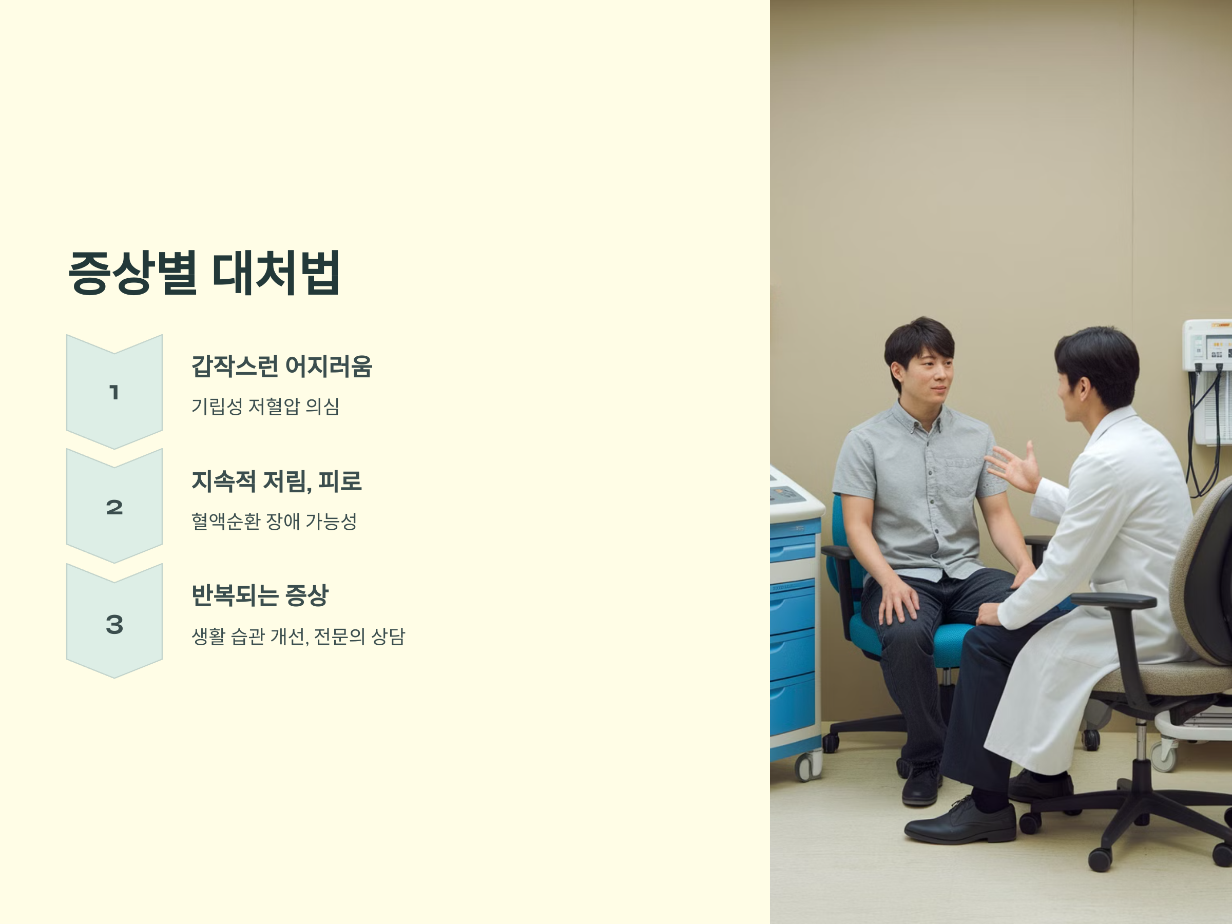 | 주요 증상 | 갑자기 일어날 때 어지러움, 눈앞이 캄캄 | 손발 저림, 만성 피로, 부종 |