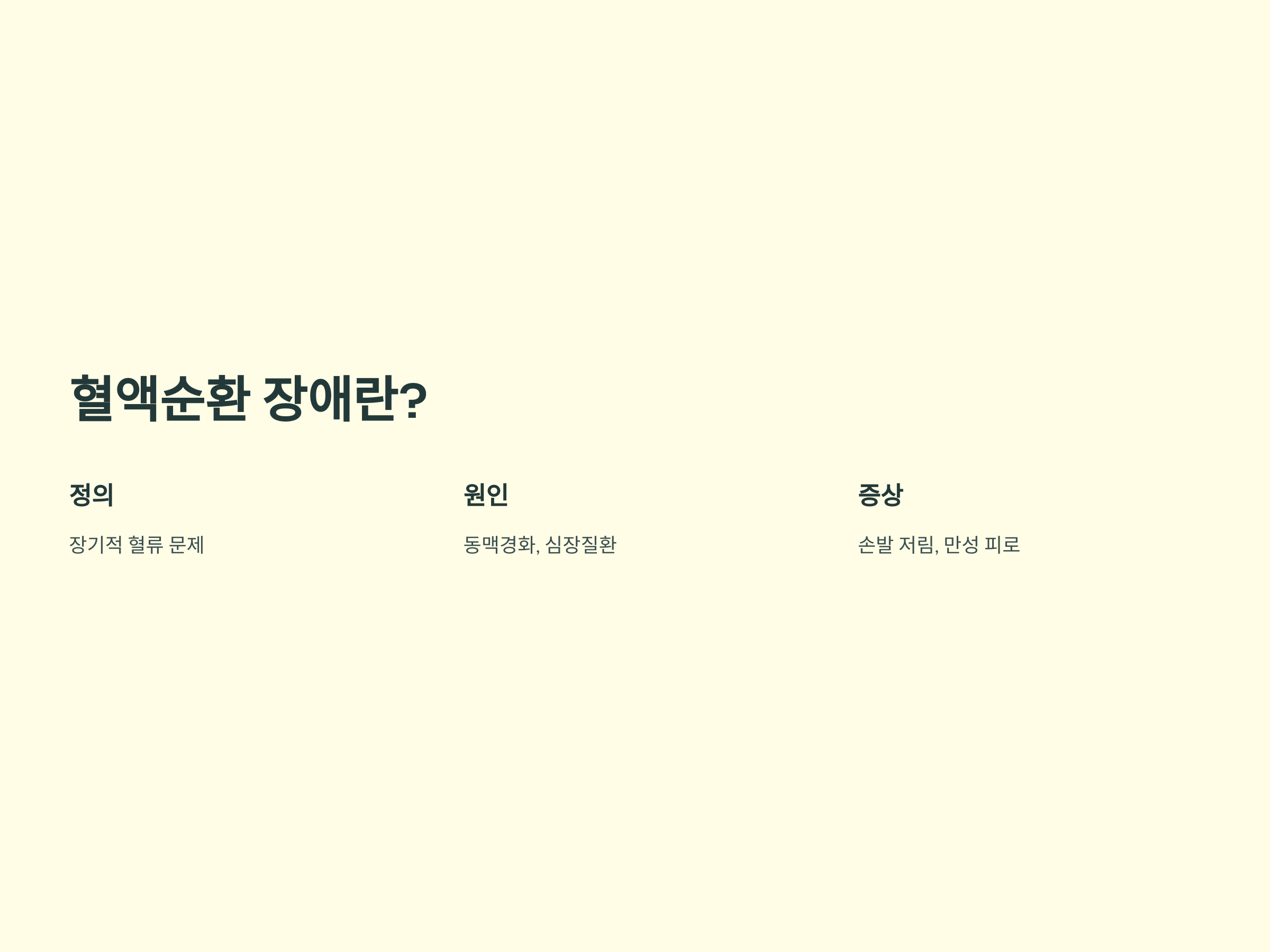 - 손발이 차고 저리거나 지속적인 피로감이 있다면 혈액순환 장애일 가능성이 큽니다.