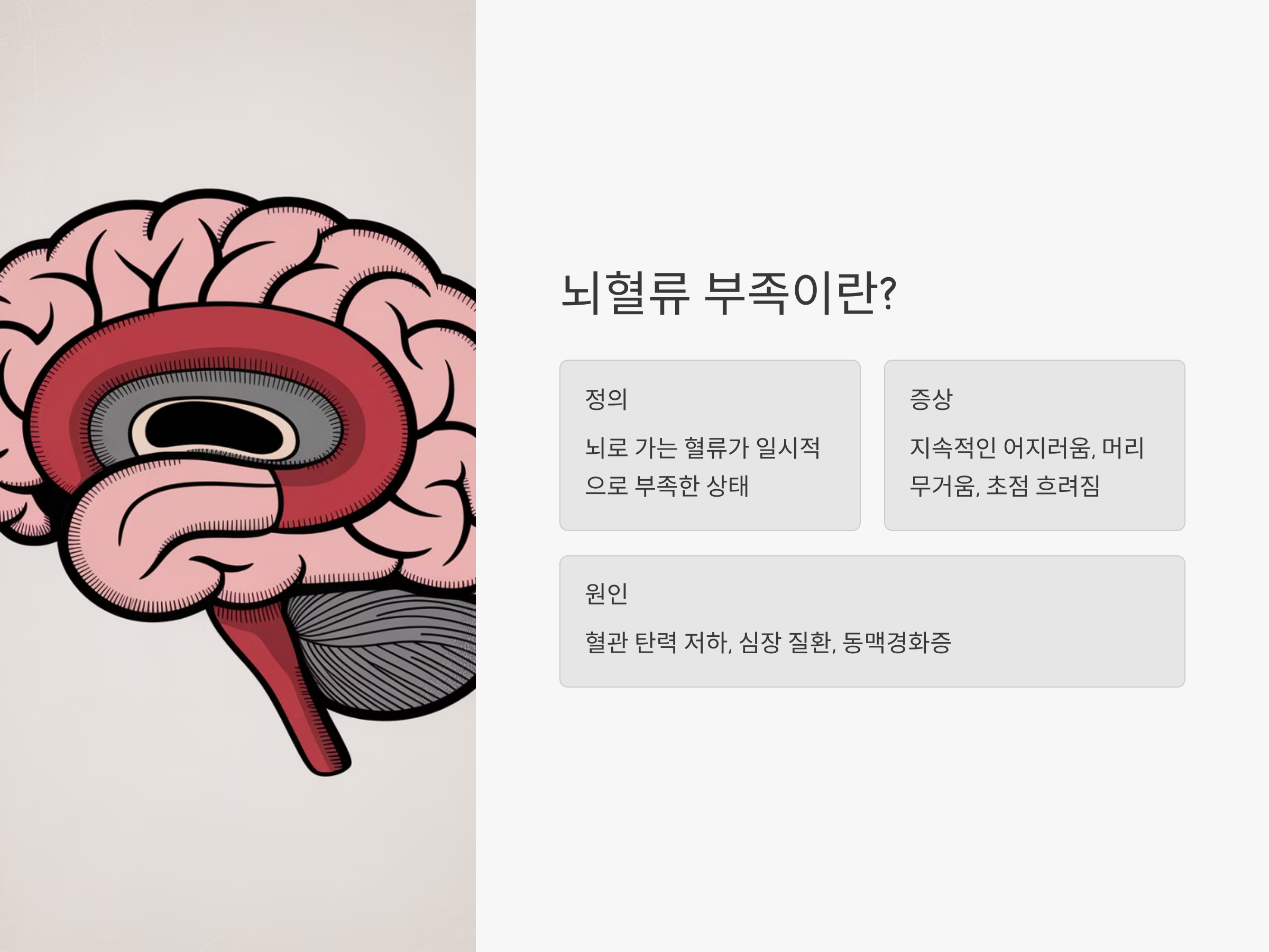 뇌혈류 부족은 뇌로 가는 혈류가 일시적으로 부족해져 발생하는 현기증을 말합니다. 이는 뇌에 충분한 산소와 영양분이 공급되지 않아 뇌 기능이 일시적으로 저하되는 상태입니다. 뇌혈류 부족은 기립성 저혈압보다 더 지속적이고, 갑작스러운 현기증이 아닌 지속적으로 어지러움을 느끼게 되는 경우가 많습니다.