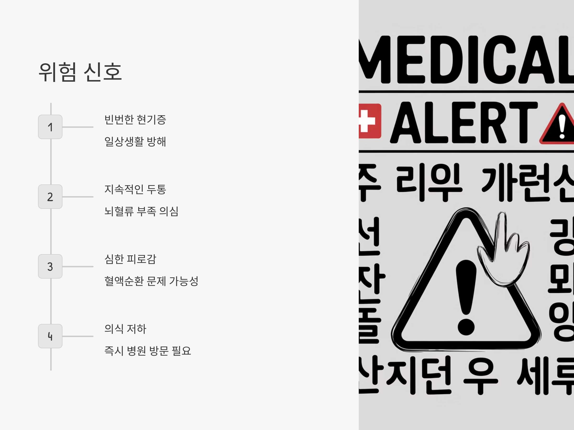 현기증을 자주 경험한다면, 기립성 저혈압이나 뇌혈류 부족과 같은 질환을 의심해볼 수 있습니다. 먼저, 일어설 때 천천히 일어나는 습관을 들이고, 혈압이 갑자기 떨어지지 않도록 조심해야 합니다. 또한, 충분한 수분을 섭취하고, 스트레스나 과도한 피로를 피하는 것이 중요합니다.