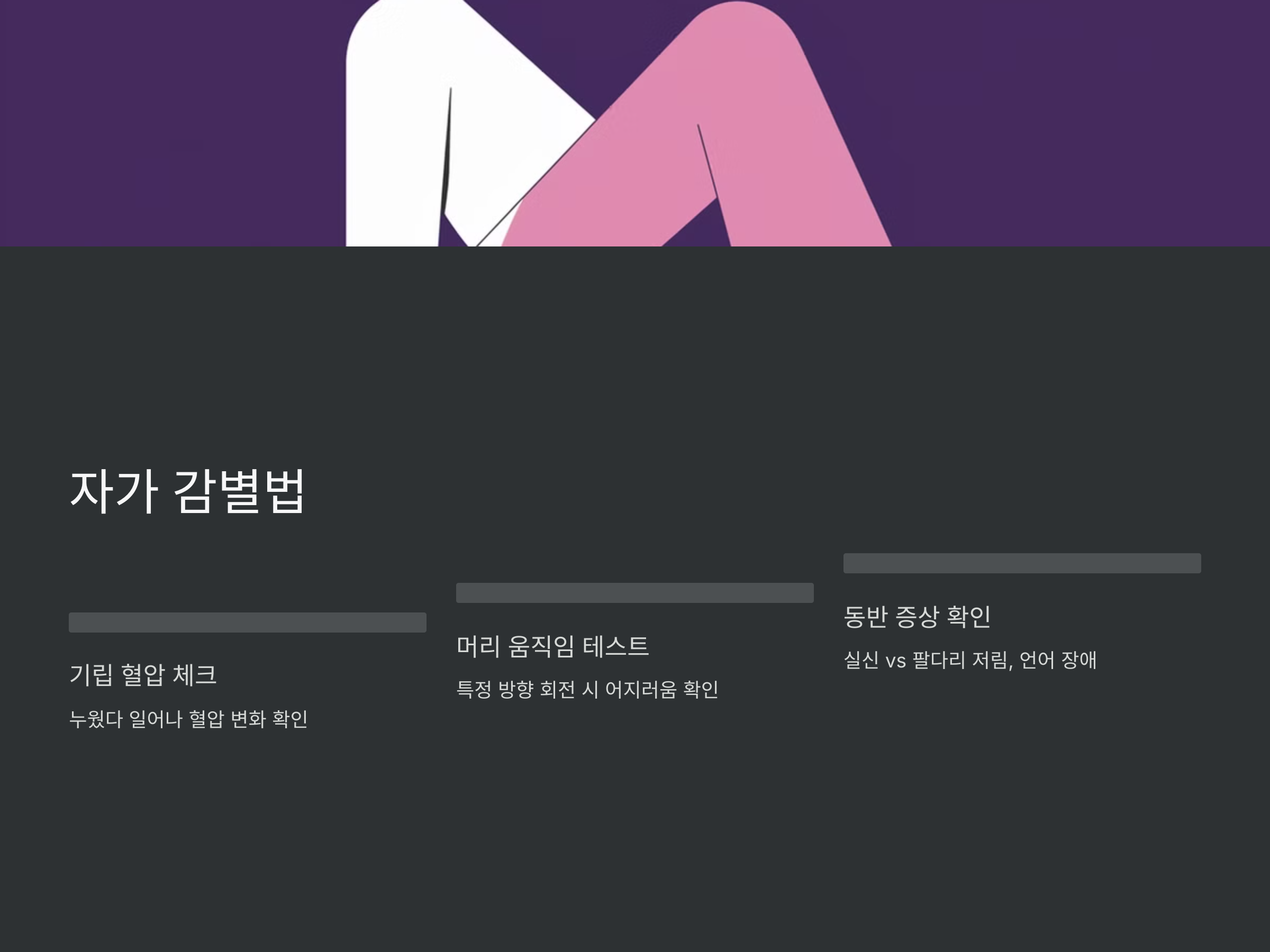 | 동반 증상 | 실신, 피로감, 식은땀, 눈앞이 캄캄함 | 팔·다리 저림, 말이 어눌해짐, 두통 |