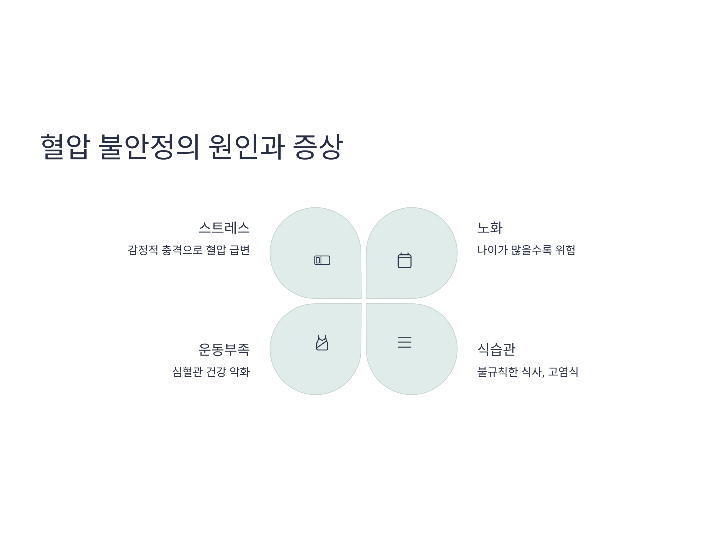 혈압 불안정은 여러 가지 원인으로 발생할 수 있습니다. 주요 원인 중 하나는 스트레스나 감정적 충격입니다. 스트레스가 심할 때 혈압이 급격히 상승하거나 떨어질 수 있습니다. 또한, 나이가 많거나 심혈관계 질환이 있을 경우 혈압이 불안정해질 수 있습니다. 불규칙한 식습관이나 운동 부족도 혈압을 불안정하게 만들 수 있습니다.