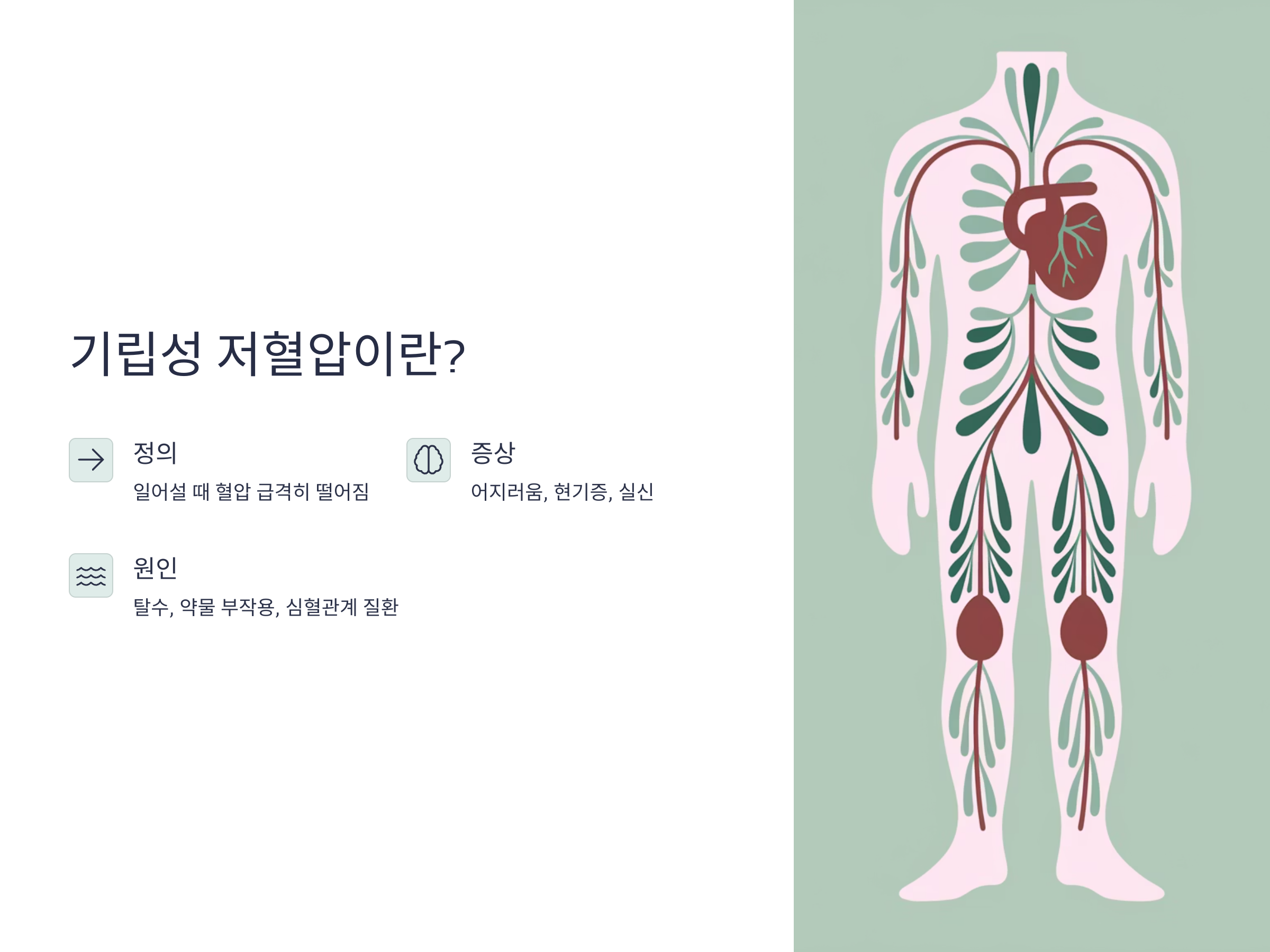 기립성 저혈압은 일어설 때 갑자기 혈압이 떨어져서 어지러움이나 현기증을 일으키는 상태입니다. 일반적으로 앉아 있거나 누워 있을 때 혈압은 정상 범위에 있다가, 일어설 때 혈압이 급격히 낮아지면서 뇌로 가는 혈류가 감소합니다. 이로 인해 어지러움, 현기증, 심한 경우 실신까지 유발할 수 있습니다.