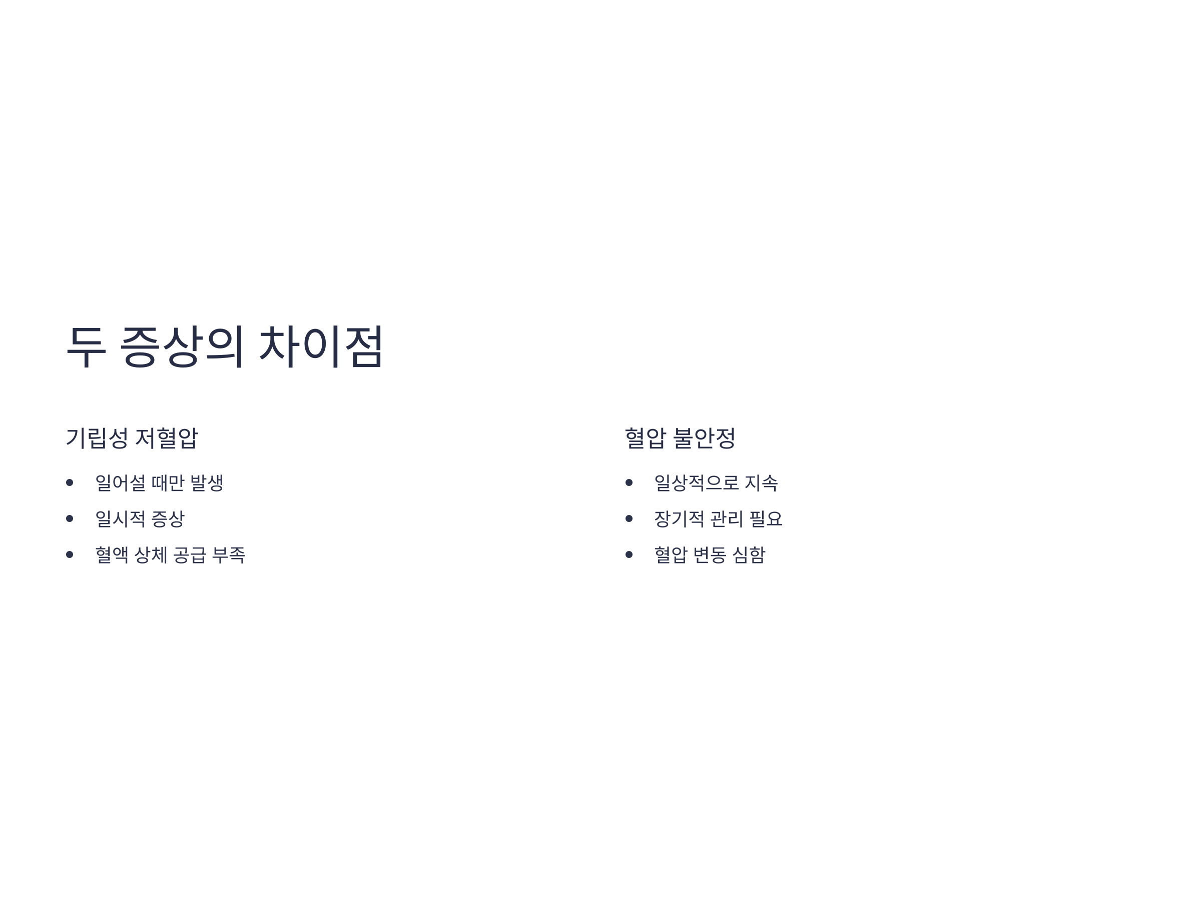 기립성 저혈압과 혈압 불안정은 둘 다 혈압 변화에 관련된 문제이지만, 그 원인과 증상의 발생 시점에서 차이가 있습니다. 기립성 저혈압은 일어설 때 갑자기 혈압이 낮아져서 발생하는 증상이며, 혈압 불안정은 혈압이 일상적으로 불안정하거나 급격히 변동하는 상태입니다. 이 두 증상은 때때로 서로 혼동될 수 있기 때문에, 정확한 진단을 받는 것이 중요합니다.
