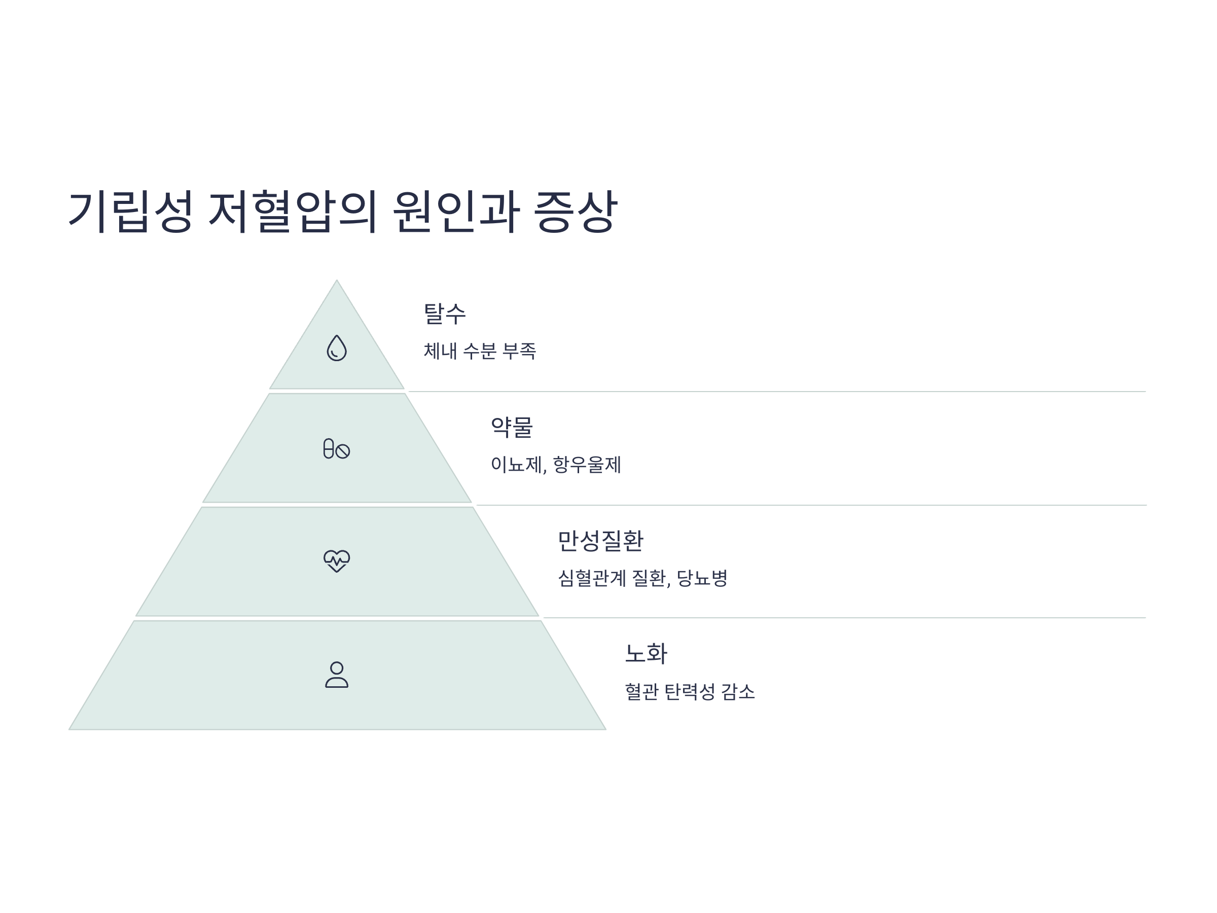 기립성 저혈압은 다양한 원인에 의해 발생할 수 있습니다. 가장 흔한 원인은 탈수로, 체내 수분이 부족하면 혈액량이 줄어들어 혈압이 낮아질 수 있습니다. 또한, 특정 약물(예: 이뇨제, 항우울제 등)은 혈압을 낮출 수 있으며, 노화로 인해 혈관이 탄력을 잃으면 기립성 저혈압이 발생할 수 있습니다. 심혈관계 질환이나 당뇨병 등의 만성 질환도 기립성 저혈압을 유발할 수 있습니다.