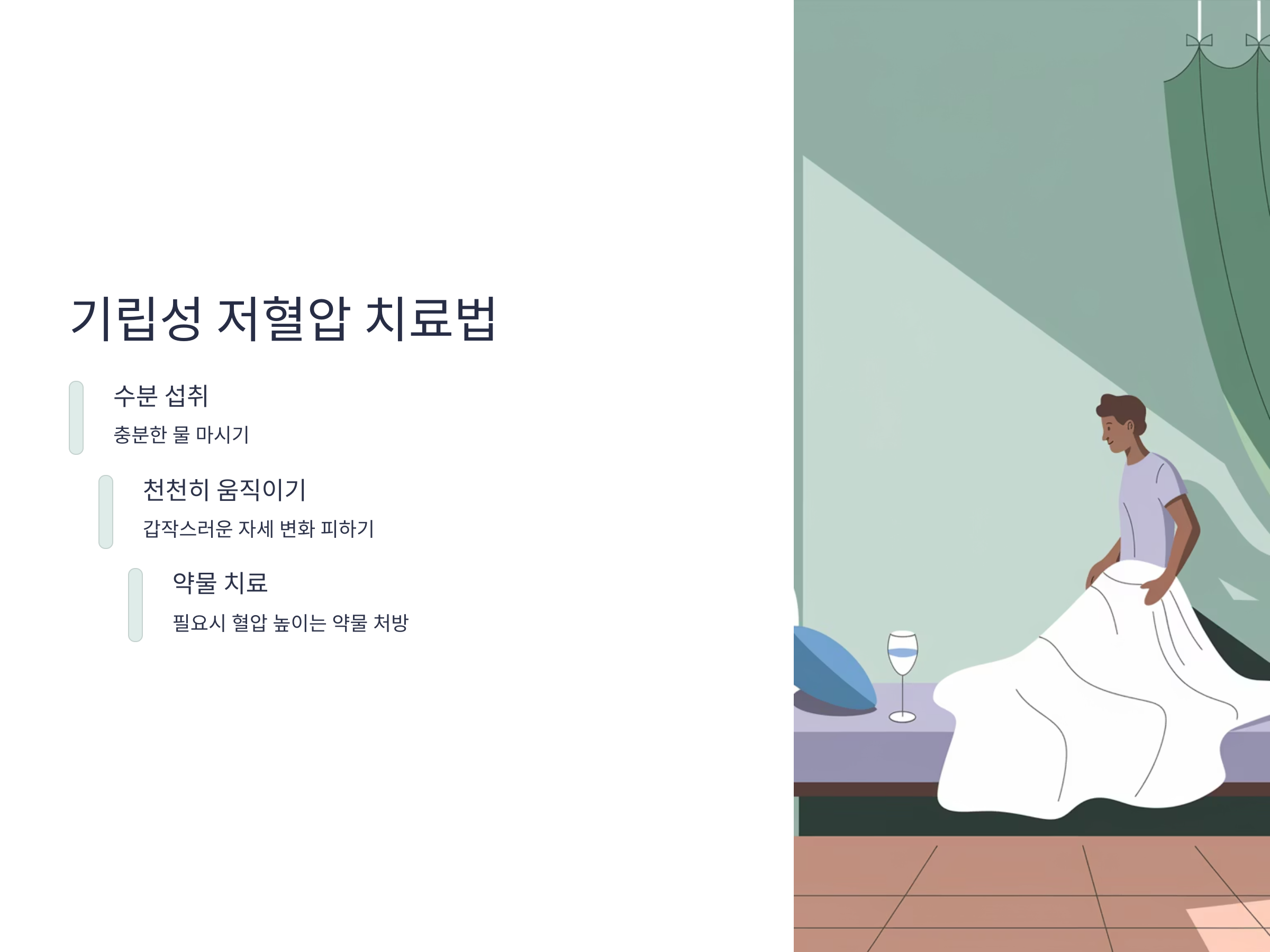 기립성 저혈압과 혈압 불안정은 각각 다른 치료 방법이 필요합니다. 기립성 저혈압의 경우, 우선 탈수를 예방하고 충분한 수분을 섭취하는 것이 중요합니다. 또한, 일어설 때 천천히 일어나며, 갑작스러운 자세 변화를 피하는 것이 도움이 될 수 있습니다. 필요에 따라 약물 치료가 필요할 수 있으며, 혈압을 높이는 약물이 처방될 수 있습니다.