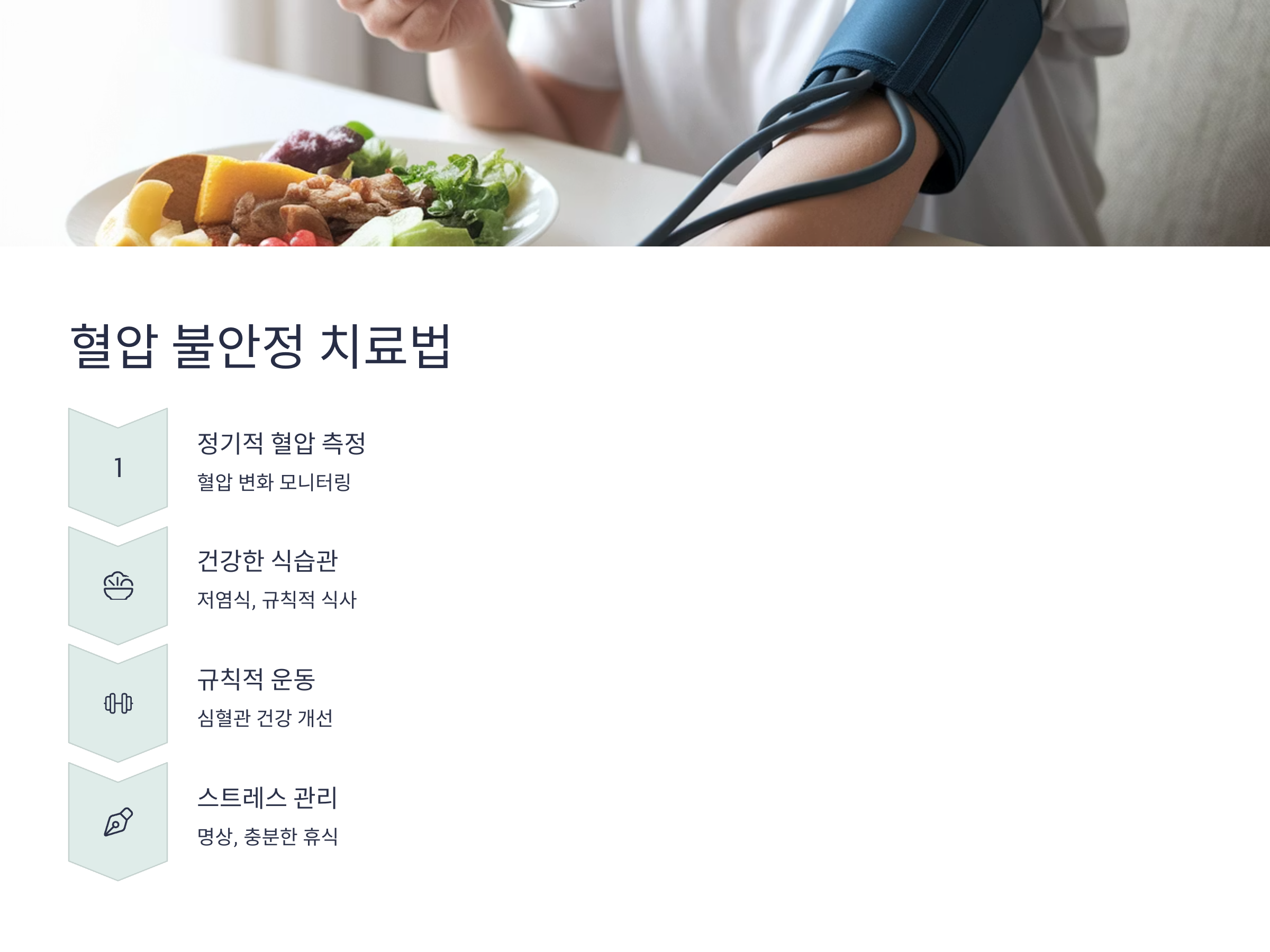 혈압 불안정은 혈압이 자주 불안정하게 변동하는 문제이므로, 정기적인 혈압 측정과 관리가 필요합니다. 건강한 식습관과 규칙적인 운동, 스트레스 관리가 중요한 역할을 합니다. 심각한 경우에는 의사의 처방을 받아 약물을 사용하거나, 더 나은 혈압 관리를 위한 치료가 필요할 수 있습니다.