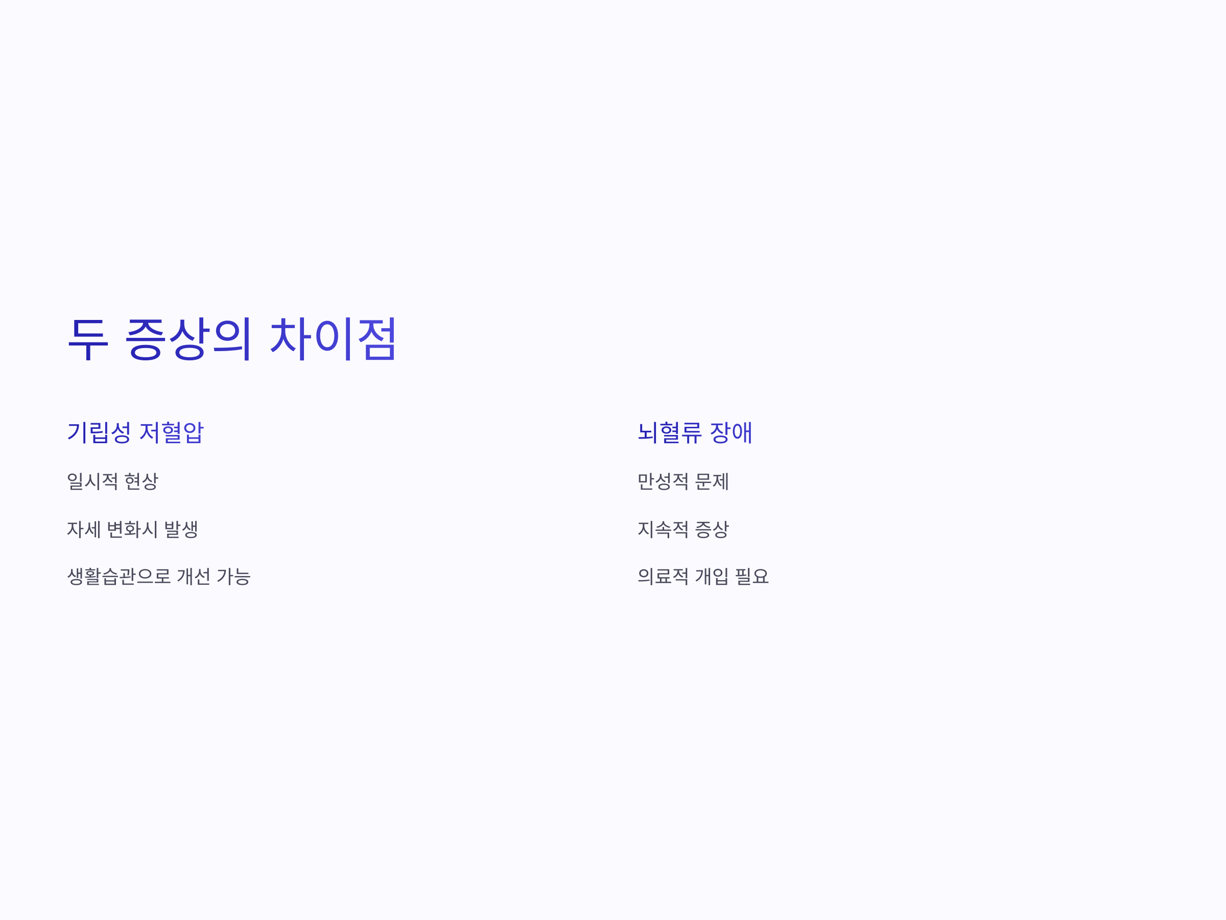 기립성 저혈압과 뇌혈류 장애는 비슷한 증상을 보일 수 있지만, 그 원인과 지속 시간에서 큰 차이가 있습니다. 기립성 저혈압은 주로 일시적인 현상이며, 혈압이 일시적으로 떨어져 뇌혈류가 부족해지는 상태입니다. 반면 뇌혈류 장애는 만성적인 혈액 흐름 장애로, 장기적인 뇌 건강 문제로 이어질 수 있습니다.