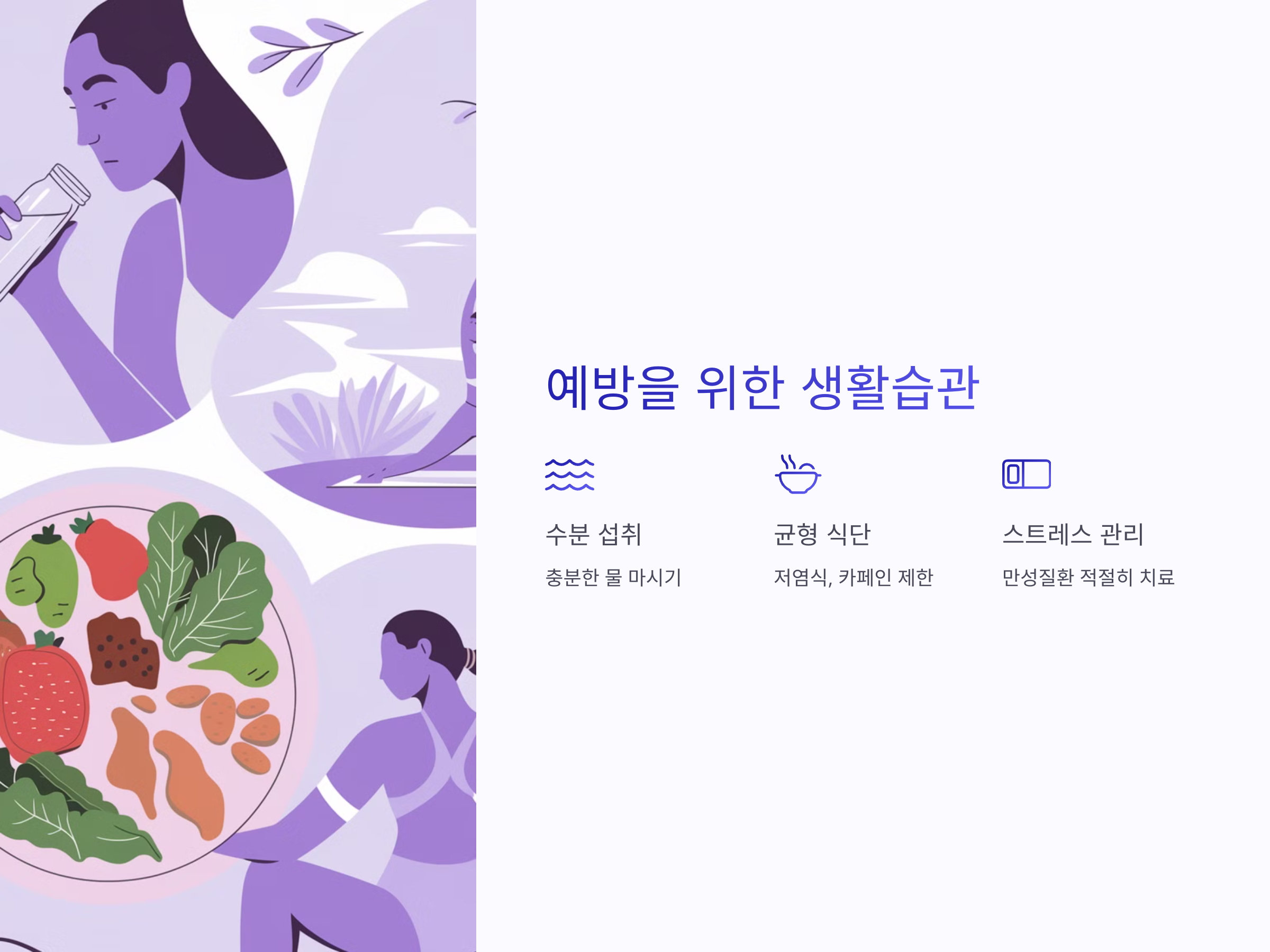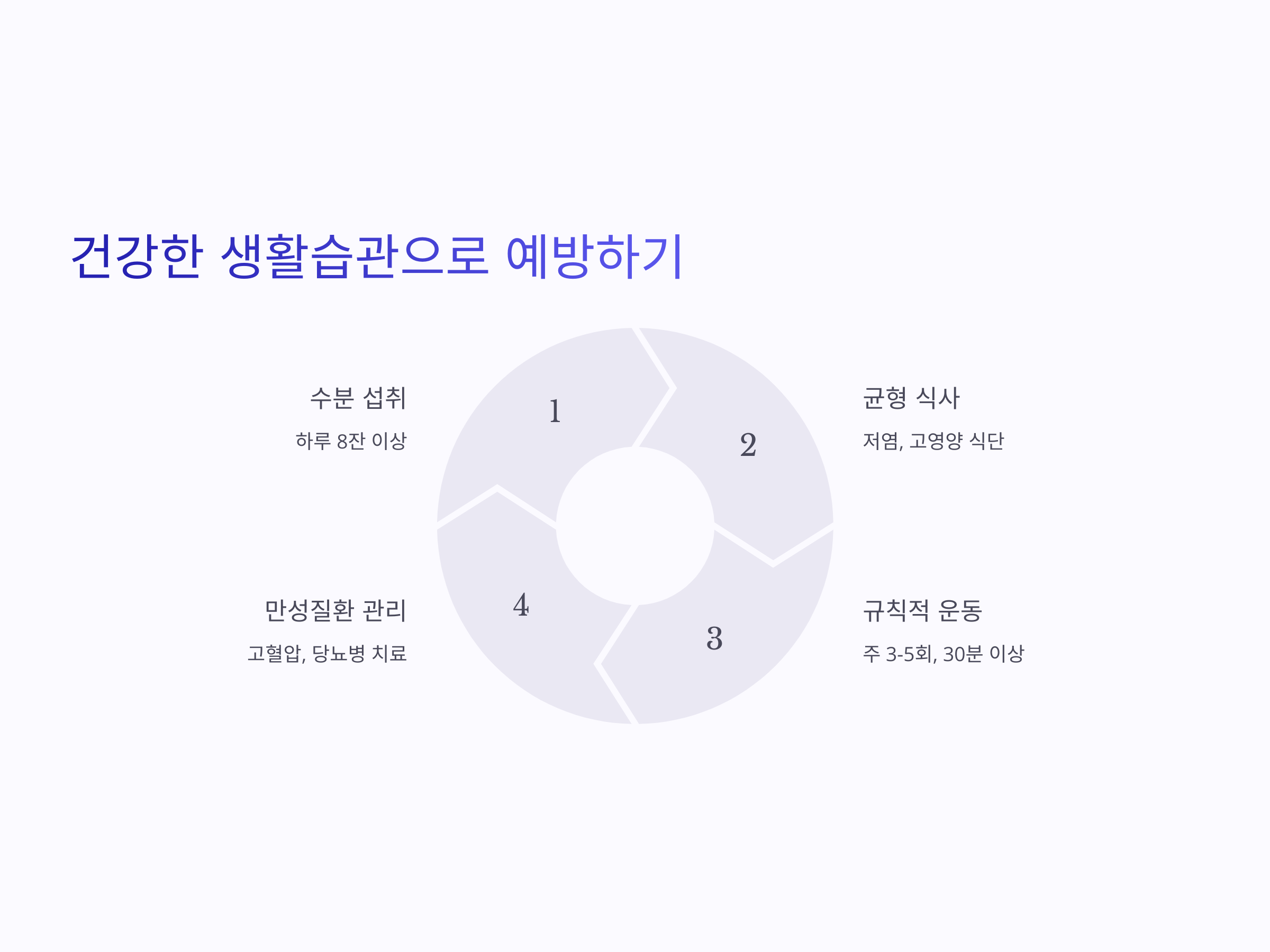규칙적인 운동을 통해 체중을 관리하고, 스트레스를 적절하게 해소하는 것도 매우 중요합니다. 고혈압이나 당뇨병과 같은 만성 질환이 있다면, 의사와 상의하여 적절한 치료와 관리를 받는 것이 필요합니다.