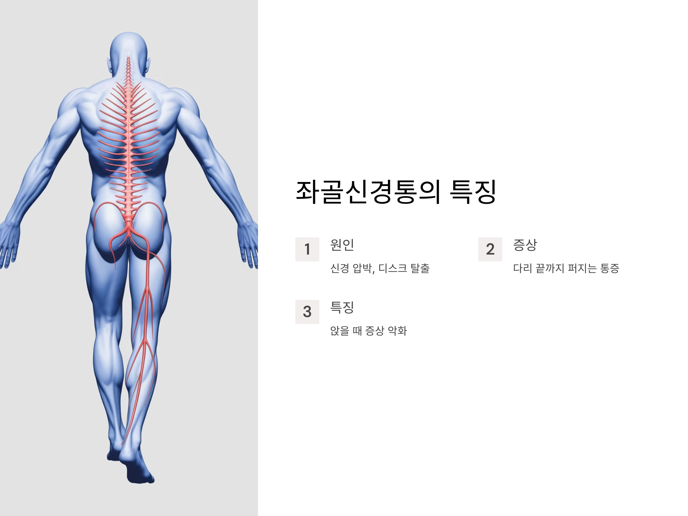 좌골신경통은 신경의 문제로, 엉덩이에서부터 다리, 발끝까지 이어지는 통증을 특징으로 합니다. 주로 좌골신경이 눌리거나 자극을 받아 발생하는데, 이는 디스크 탈출이나 신경 압박 등으로 발생할 수 있습니다. 앉아 있을 때 이러한 통증이 심해지는 경우가 많으며, 특히 한쪽 다리의 저림이 두드러지기도 합니다.