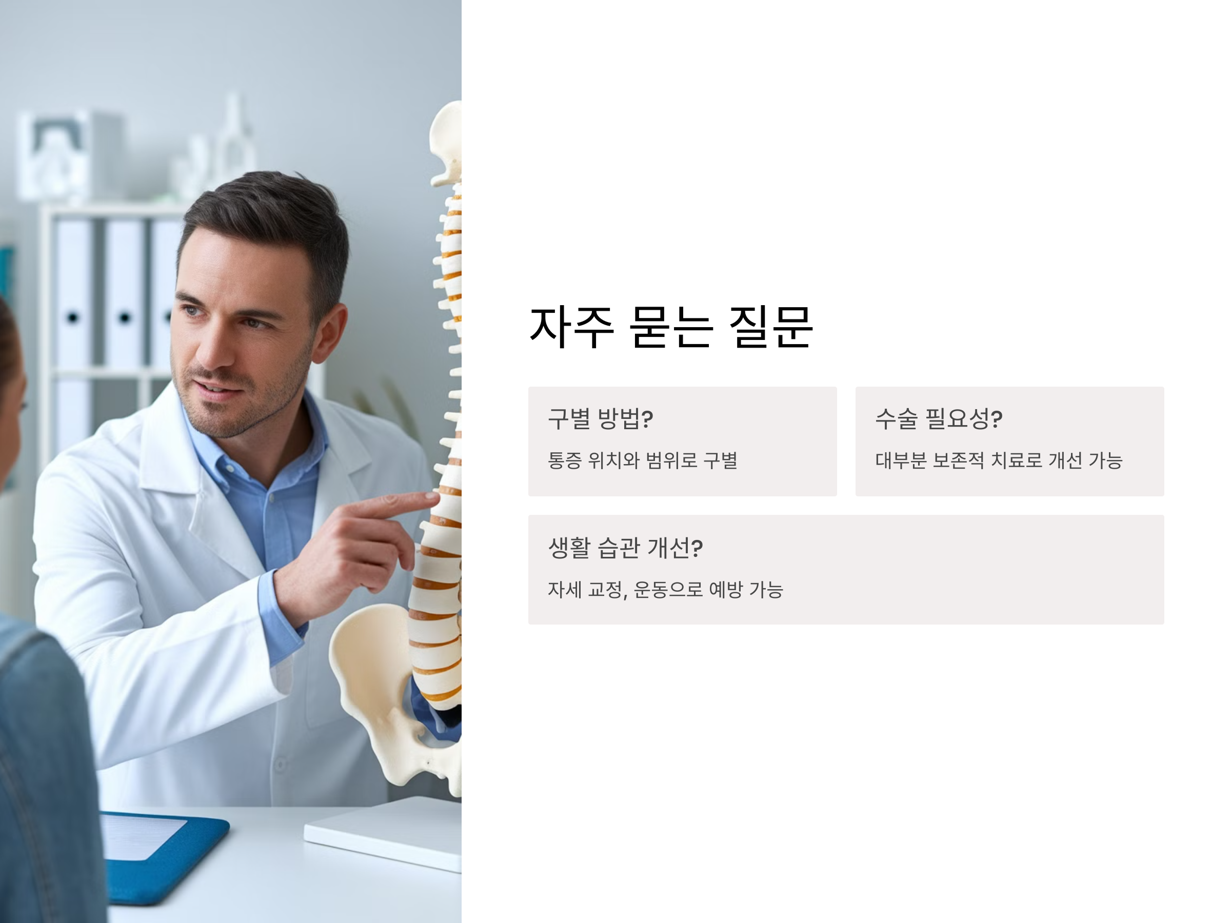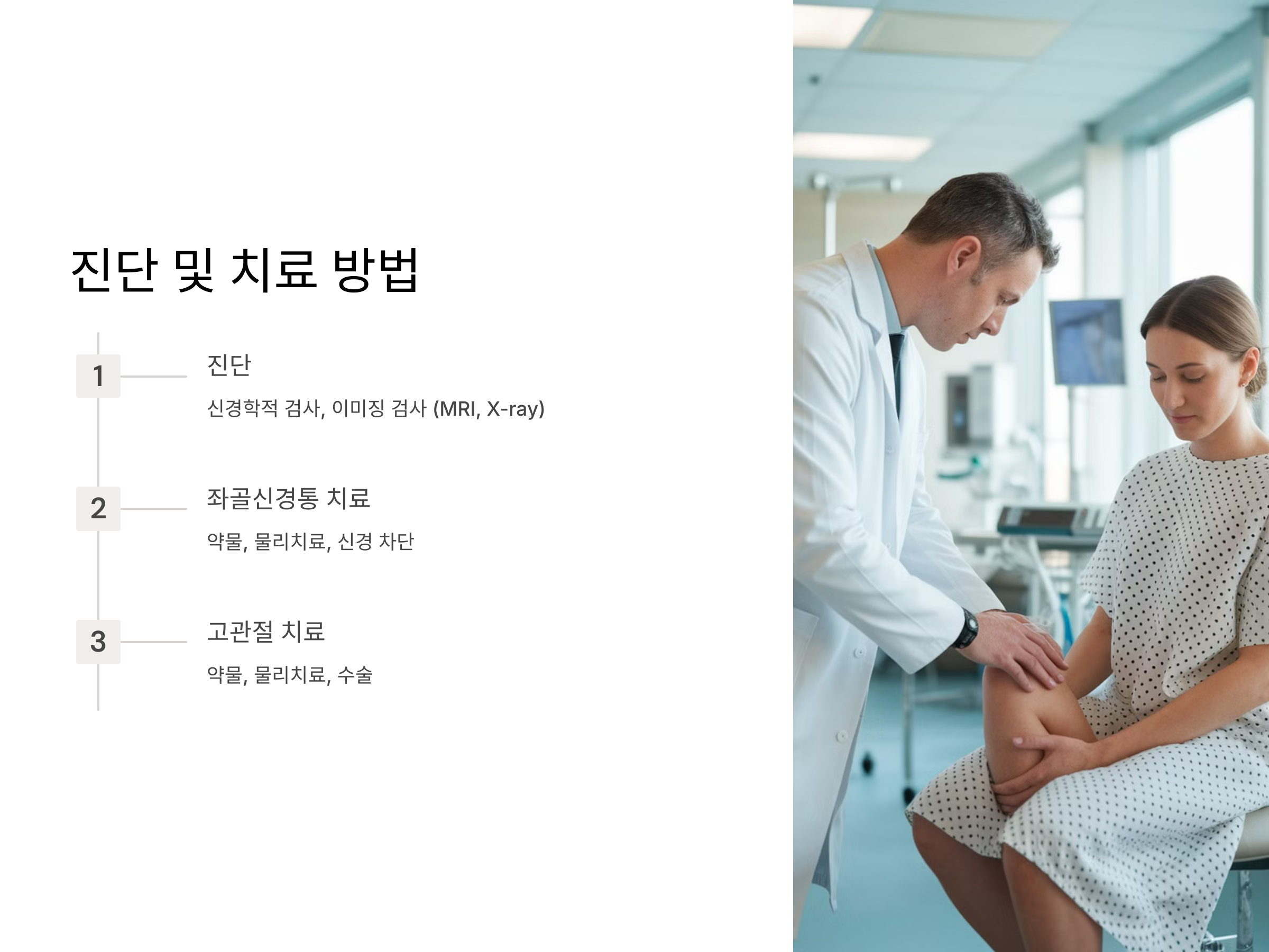 - 치료 방법: 좌골신경통은 신경 치료, 고관절 문제는 관절 치료