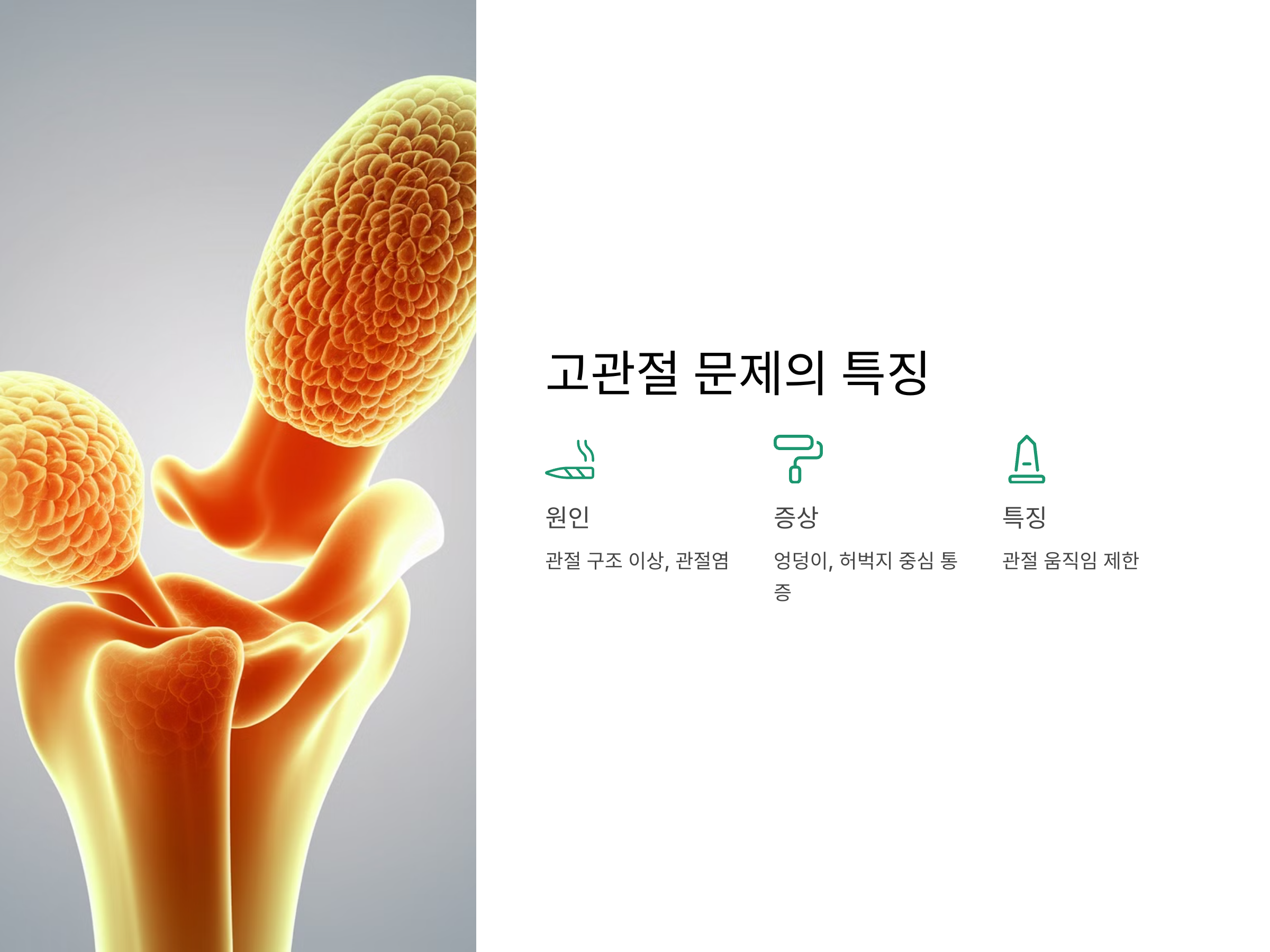 고관절 문제는 관절염, 골절, 혹은 근육과 인대의 손상 등으로 발생할 수 있으며, 통증 외에도 관절의 움직임이 제한되거나, 특정 자세에서 불편함을 느낄 수 있습니다. 고관절 문제는 좌골신경통과 달리 다리의 전반적인 통증보다는 엉덩이나 허벅지의 국소적인 통증에 집중되는 경우가 많습니다.